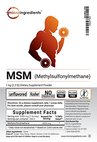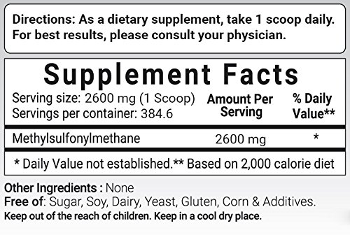 MSM (methylsulfonylmethane) is an organic sulfur-containing compound which is used to improve immune function, lower inflammation and help restore healthy body tissue. It may also help with digestive system and skin repairation. The biologically active sulfur from MSM may help collagen and keratin production and maintenance.