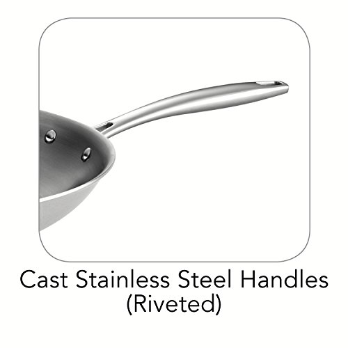 Tri-Ply clad construction (18/10 stainless steel, aluminum core, magnetic stainless steel) for quick and even heat distribution, without hotspots