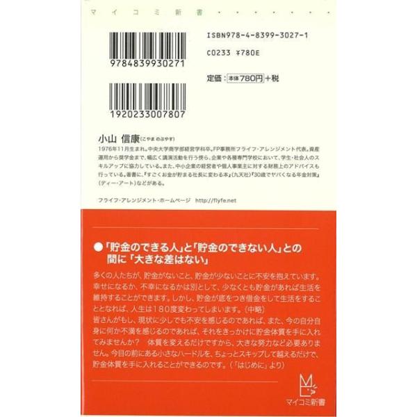 【商品基本情報】 商品名称:貯金のできる人できない人-マイコミ新書 著者/出版社:小山 信康/小山 信康 初版発行日:2009/01/30 サイズ:新書判 ページ数:192 ISBN/JAN:9784839930271/4528189415294