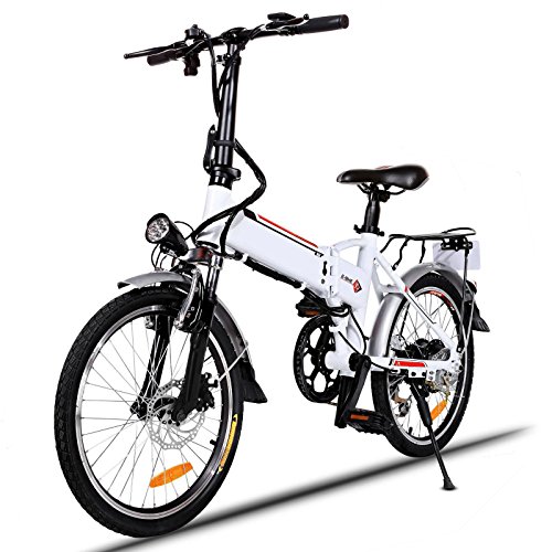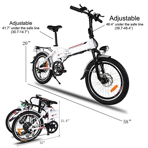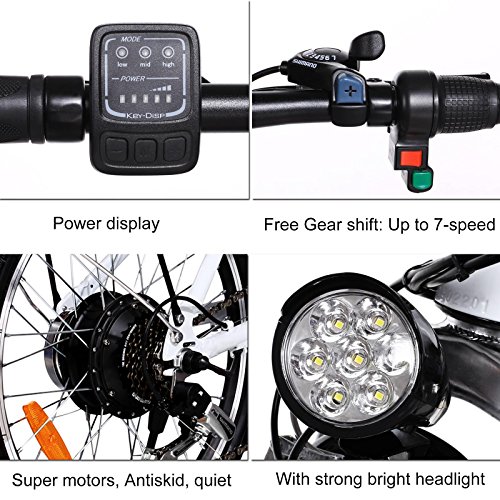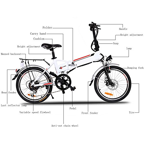 Frame Material: Aluminum Alloy Color: White Full Length: 149cm/58.1 inch Wheel Diameter: 48cm/18.7 inch Seat Height: 70-113cm/27.3-44.1 inch Handlebars length: 57cm/22.2 inch Package Size: 126*32*70cm Basic information: Vehicle weight: About 19kg Battery weight: About 2.2kg Mileage: 35-70km Load capacity: 150kg Maximum speed: 25-35km/h Type: Mountain Bicycle Details: Front Fork: High-strength carbon steel comfort shock absorption Tire: Lithium Back Shelf: High-carbon steel high strength simple Brake system: Front Aluminum Alloy V Brake, Electric?Back ?brake Gear shift system: Back 7-speed transmission system Handlebars: Aluminum Alloy Lithium battery: 36V Motor: 250W high speed brushless gear motors Saddle tube: Aluminum Alloy Extended seat tube Headlight: Bright LED headlamp and horn Front and rear wheels: Double layer Aluminum Alloy wheel Fender: Roasted silver paint iron Fender Charging time: 4-6 hours Features: 1: 1 assisting riding, full electric riding and full manual riding Package Content: 1 x Mountain Bike (with accessory) Note: Due to the difference between different monitors, the picture may not reflect the actual color of the item. We guarantee the style is the same as shown in the pictures, but not the same performance on different bodies as on the model. Thank you! 0 |