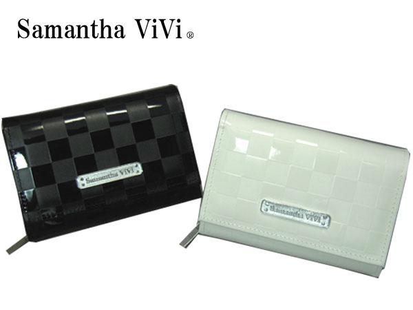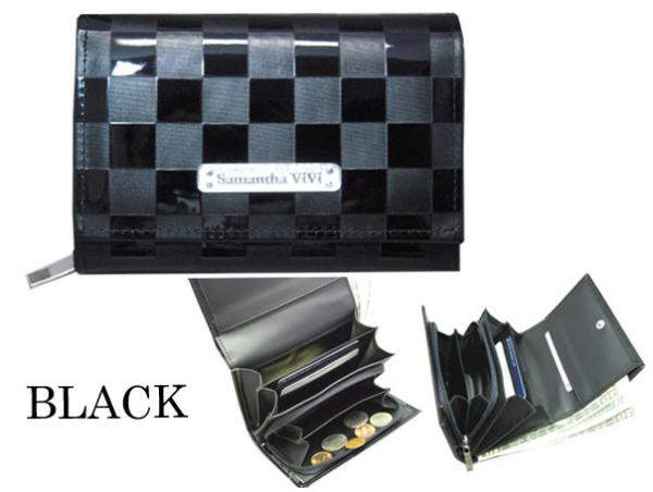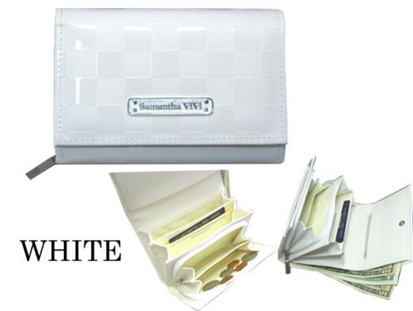 エナメル生地にチェック型押し加工を施しました。エポ加工のロゴ入プレートメタル付。【商品名】SVB-14C かぶせ札入 WHホワイト