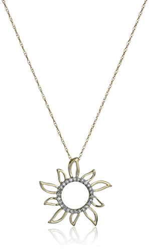 -. Binding : Jewelry -. Brand : Amazon Collection -. Department : women -. Feature : Necklace featuring sun pendant in lustrous yellow gold with ring of round-cut diamonds / 18" rope chain with sP.R.Ing-ring clasp / All our diamond suppliers confirm that they comply with the Kimberley Process to ensure that their diamonds are conflict free. / Imported / Carat weight listed is the total for all stones. -. Label : Amazon Curated Collection -. Manufacturer : Amazon Curated Collection -. Model : 2414950080Y -. MPN : 2414950080Y -. PartNumber : 2414950080Y -. ProductGroup : Jewelry -. ProductTypeName : FINENECKLACEBRACELETANKLET -. Publisher : Amazon Curated Collection -. Studio : Amazon Curated Collection -. Title : 10k Yellow Gold Diamond Accent Sun Pendant Necklace