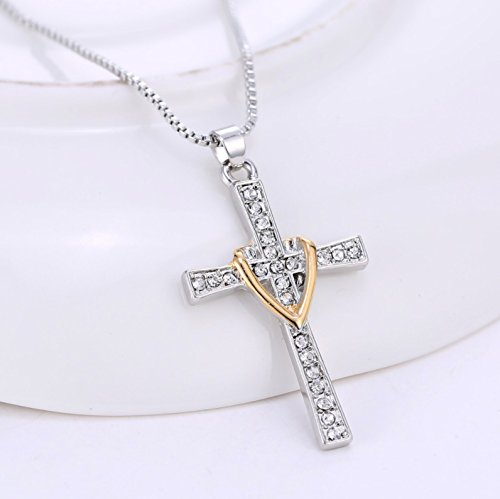 -. Feature : High polished two tone cross and heart pendant / Crystal accents, 18 inches chain with lobster clasp / Pendant measures approximately 0.84 inch wide and 1.44 inch tall / Packaged in a lovely gift box / Ideal for Baptism, Christening, Mothers day, anniversary, birthday, graduation, Christmas, and casual wear