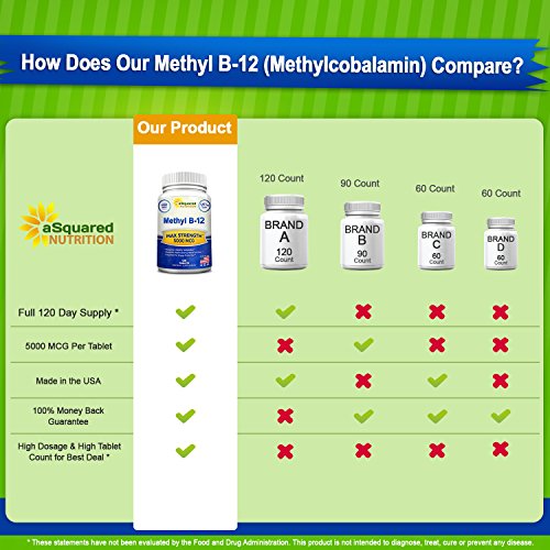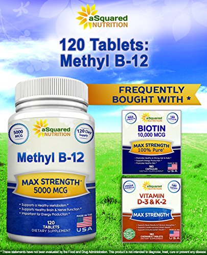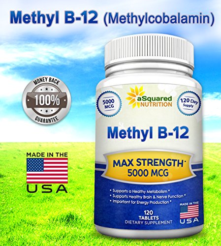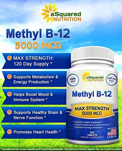 -. Binding : Health and Beauty -. Brand : aSquared Nutrition -. EAN : 0641799787644 -. Feature : BEST VALUE ON AMAZON - HIGH POTENCY - HIGH SUPPLY - Our all-natural Vitamin B12 (Methyl) supplement contains 5000mcg per tablet, plus you receive 120 tablets for a FULL 120 day supply (other brands offer a less potent product, and less supply at a more expensive price). Our Vitamin B-12 is backed by our "best in the industry" 100% MONEY BACK GUARANTEE. / ENERGY, HEALTH, WELLNESS - Our Vitamin B12 (Methylcobalamin) supports your metabolism by helping it convert fats, carbs, and proteins into energy much more efficiently. More than a memory enhancer, our Vitamin b-12 helps improve energy, support a strong nervous system, and even boost your body's metabolic function. Get ready to feel energized, alert, and in a terrific mood again. / COGNITIVE FUNCTION & DIGESTIVE SYSTEM HEALTH - Our natural Vitamin B12 is a great way to help improve brain function, maintain healthy brain cells, and reduce overall fatigue. Try our essential Vitamin B 12 supplement to ease your stomach problems, and give your digestive function some much-needed relief. Our Vitamin B Complex can help your constipation, an upset stomach, as well as constipation. And if you are a man, it has been known that our Vitamin B-Complex benefits men's fertility. / HEART & SKIN HEALTH - aSquared Nutrition's Vitamin B12 helps out many facets of the human body. There are tremendous benefits to cardiovascular heart health, as well as the skin looking clear, blemish-free, and healthy! Our B12 vitamins come in a time released tablet pill format, not to be mistaken with vitamin b12 injections , vitamin b12 liquid , vitamin b12 patch , vitamin b12 chewable gummy, or vitamin b12 spray , vitamin b-12 sublingual capsule , vitamin b-12 shot , or b-12 drop. / SAFE & NATURAL FORMATION - We only use all-natural, premium Vitamin B-12 in our formula, and go the extra mile to ensure that our supplements have passed extensive quality control testing before being bottle and sold. Plus asquared Nutrition only uses FDA regulated GMP certified manufacturing facilities in the USA. Our completely water-soluble vitamin won't upset your stomach like similar supplements because ours doesn't contain citric acid, artificial sweeteners, or xylitol -. IsAdultProduct : 0 -. Label : aSquared Brands -. LegalDisclaimer : These Statements have not been evaluated by the Food and Drug Administration. This Product is not intended to diagnose, treat, cure or prevent any disease. -. Manufacturer : aSquared Brands -. PackageQuantity : 1 -. ProductGroup : Health and Beauty -. ProductTypeName : HEALTH_PERSONAL_CARE -. Publisher : aSquared Brands -. Studio : aSquared Brands -. Title : Vitamin B12 - 5000 MCG Supplement with Methylcobalamin (Methyl B-12) - Max Strength Vitamin B 12 Support to Help Boost Natural Energy & Metabolism, Benefit Brain & Heart Function - 120 Tablets -. UPC : 641799787644
