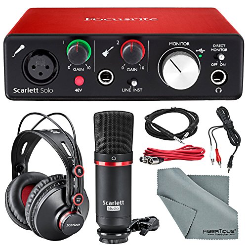 Focusrite Scarlett Solo Studio Kit Bundle –Contains Focusrite Scarlett Solo USB Audio Interface + CM25 Condenser Microphone + HP60 Studio Headphones and + Cables, Fibertique Cleaning Cloth
