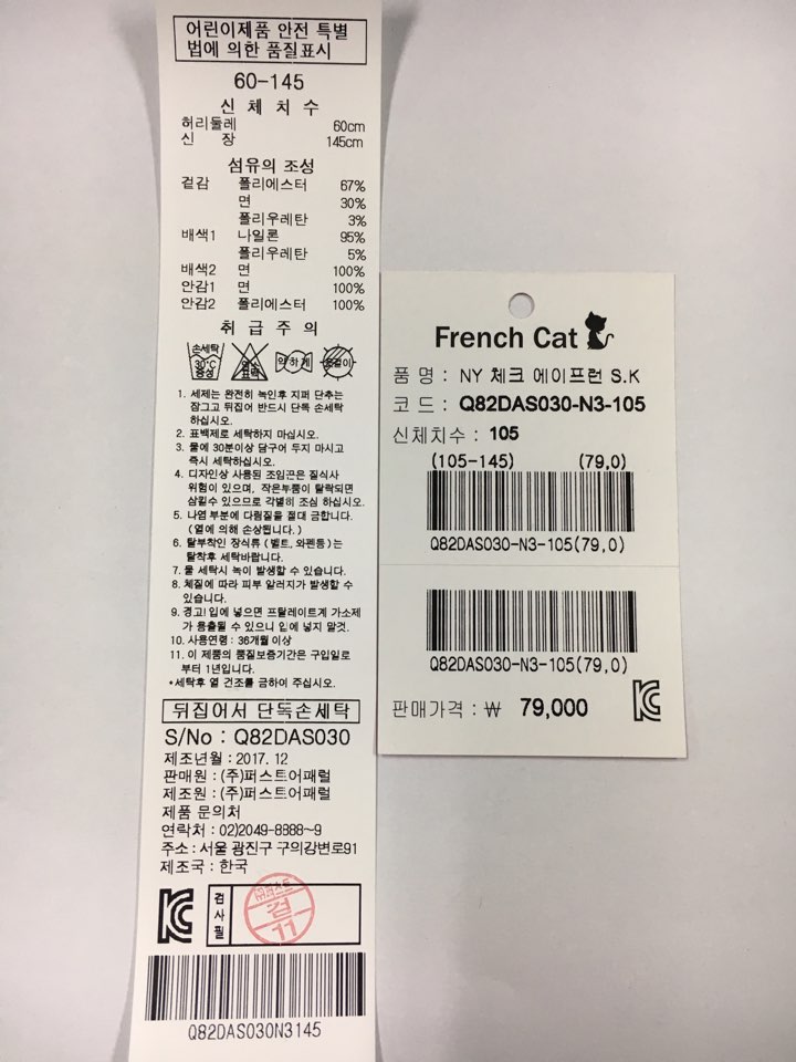 제품소재 : 겉감폴리에스터 67% 면30% 폴리우레탄3%배색1 나일론 95%폴리우레탄5% 배색2 면100% 안감1 면100%안감2 폴리에스터100%