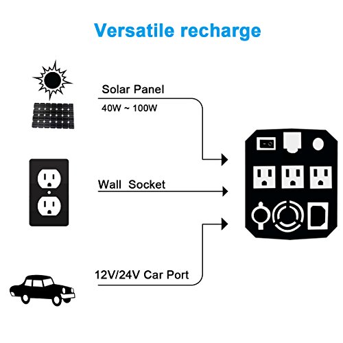 3 Ways Input Charging- Home wall AC outlet power,Car cigarette DC 12V/24V power and from 40W/0.053Hp to 100W/0.13Hp solar power panel(Not included),do not worry about the fuel.