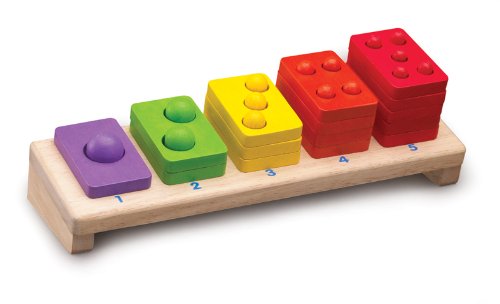 FEATURES -Wooden Activity Toy with Bright Primary Colored Stackable Pieces