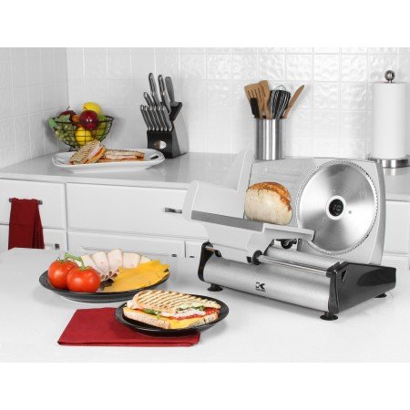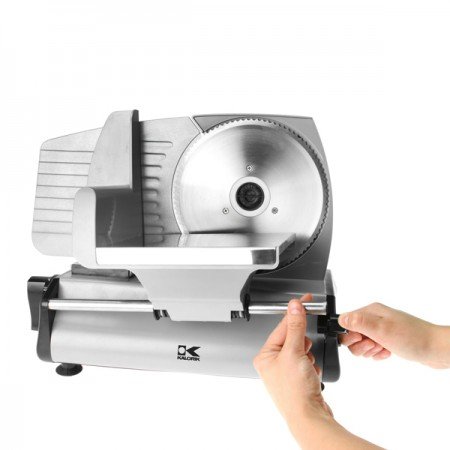 Stop paying extra for pre-sliced food! Slice your own meat, cheese, bread, vegetables, and fruit quickly and easily with this high-quality slicer from Kalorik. This stylish aluminum housed slicer features a specialized curve design for ease of slice removal as well as space to catch and organize your cuts. Our professional-style precise thickness control knob makes selecting your cut thickness simple and easy, up to 9/16" (15mm). The large multipurpose 7 1/2 inch serrated stainless steel blade handles a wide range of food sizes and types and is easily removable without the use of any tools for cleaning and storage. In addition, the quick release food carriage bar enables overall cleaning by hand or in the sink! Other highlights include; non-slip suction feet, and a strong, high-quality 180 watt AC motor.Feature