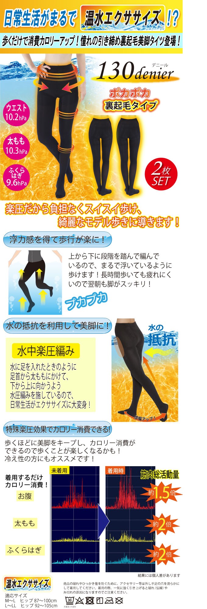 ウォーターウォーキング裏起毛美脚ハイウェストタイツ 2枚組