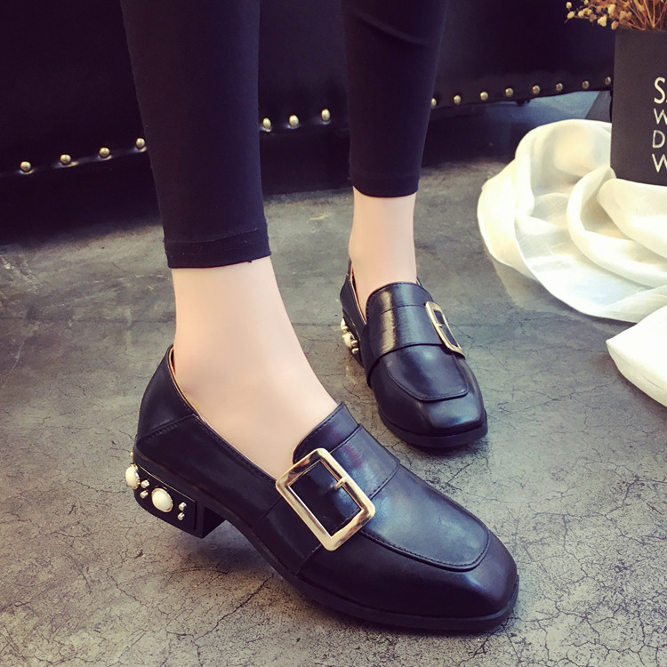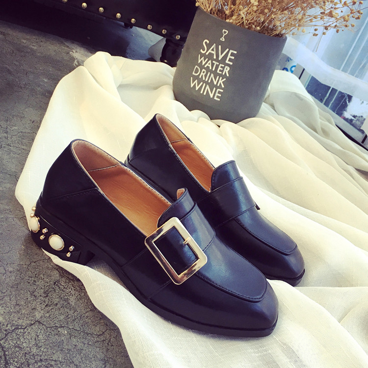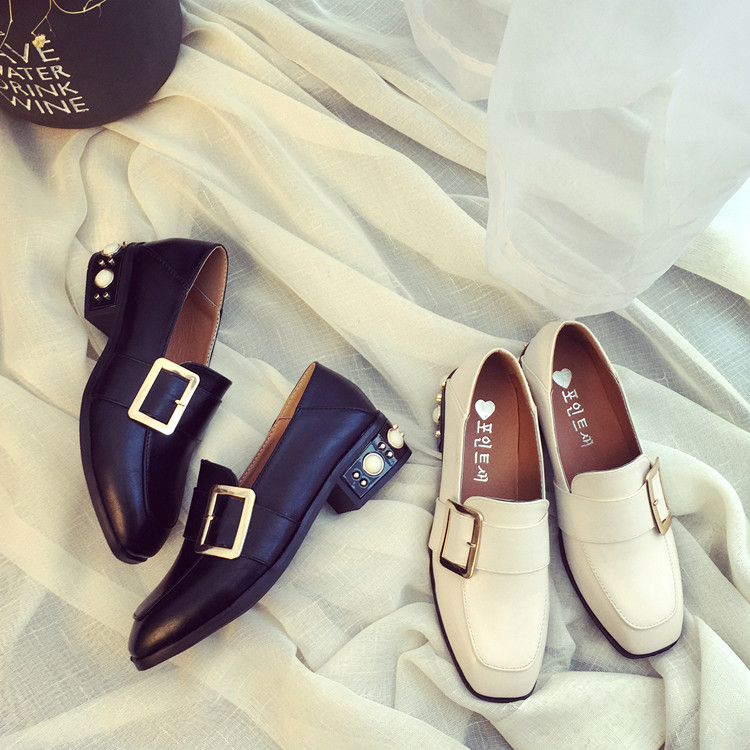 春秋季新款英伦复古小皮鞋方头女浅口珍珠平底粗跟乐福单鞋子