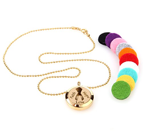 Faith Hope Love Aromatherapy Essential Oil Diffuser Necklace Locket Pendant Jewelry Gift Set with 20" & 24" Chains and Multi-Colored Oil Pads (Gold)