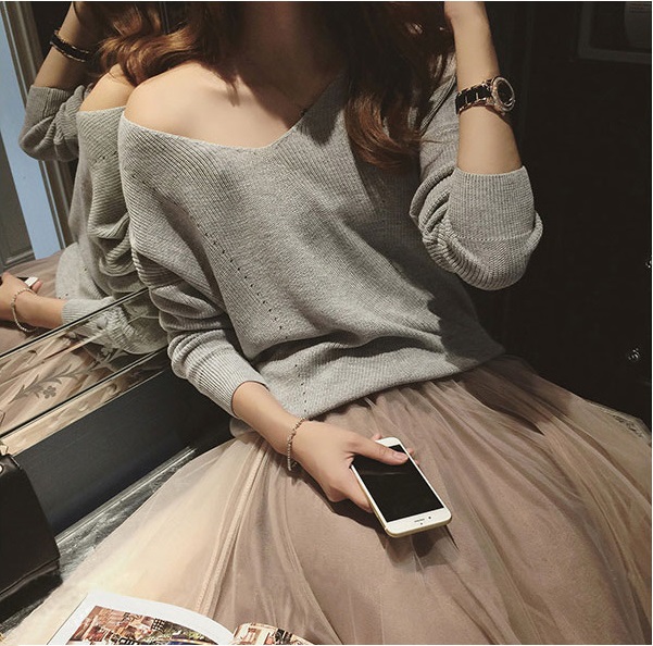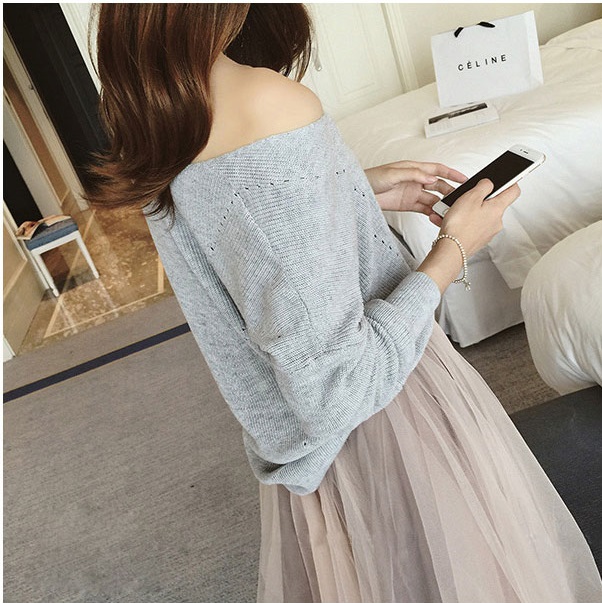 フレア 長袖 無地 ミディアム カジュアルスタイル デコルテ魅せ