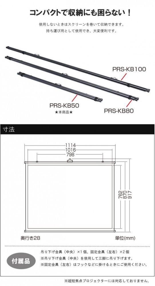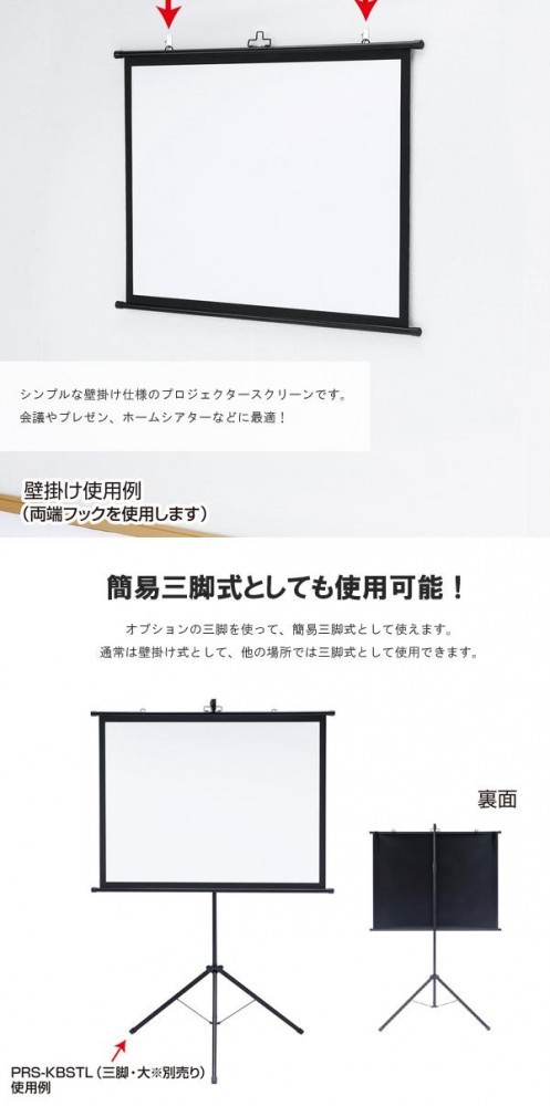 使用しないときはスクリーンを巻いて収納できます。オプションの三脚を使って、簡易三脚式として使用可能。通常の三脚式と比べて軽量で、プロジェクタースクリーンと三脚が分離できるので取り回しが簡単です。 |