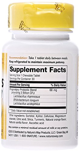 -. Binding : Health and Beauty -. Brand : Nature's Way -. EAN : 0611720457069 -. Feature : 30 Count (Pack of 3) - 90 Count Total / 3 billion CFUs / Bifidobacteria & lactobacillus strains including acidophilus / 3 strain formula specifically designed for kids ages 2-12 years -. IsAdultProduct : 0 -. Label : Nature's Way -. Manufacturer : Nature's Way -. Model : No Model Number -. MPN : No Part Number -. PackageQuantity : 1 -. PartNumber : No Part Number -. ProductGroup : Health and Beauty -. ProductTypeName : HEALTH_PERSONAL_CARE -. Publisher : Nature's Way -. Studio : Nature's Way -. Title : Nature's Way P.R.Imadophilus for Kids, Orange, 30 Count (Pack of 3) -. UPC : 611720457069