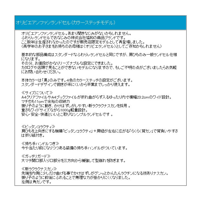 원본상품명: オリビエアンファン カラ?ステッチ ランドセル (?×ブラックステッチ)クラリ?ノエフ艶消し A4フラットファイル??サイズ送料無料?れ筋