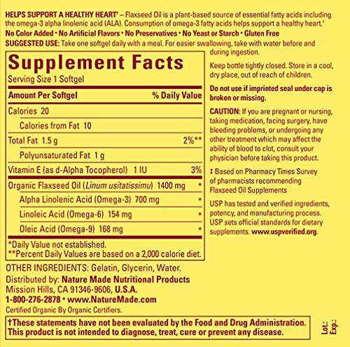 Trust your heart with Nature Made Flaxseed Oil 1400 mg. Flaxseed Oil is a plant-based source of essential fatty acids including the omega-3 alpha linolenic acid (ALA). Consumption of omega-3 fatty acids help support a healthy heart.Feature