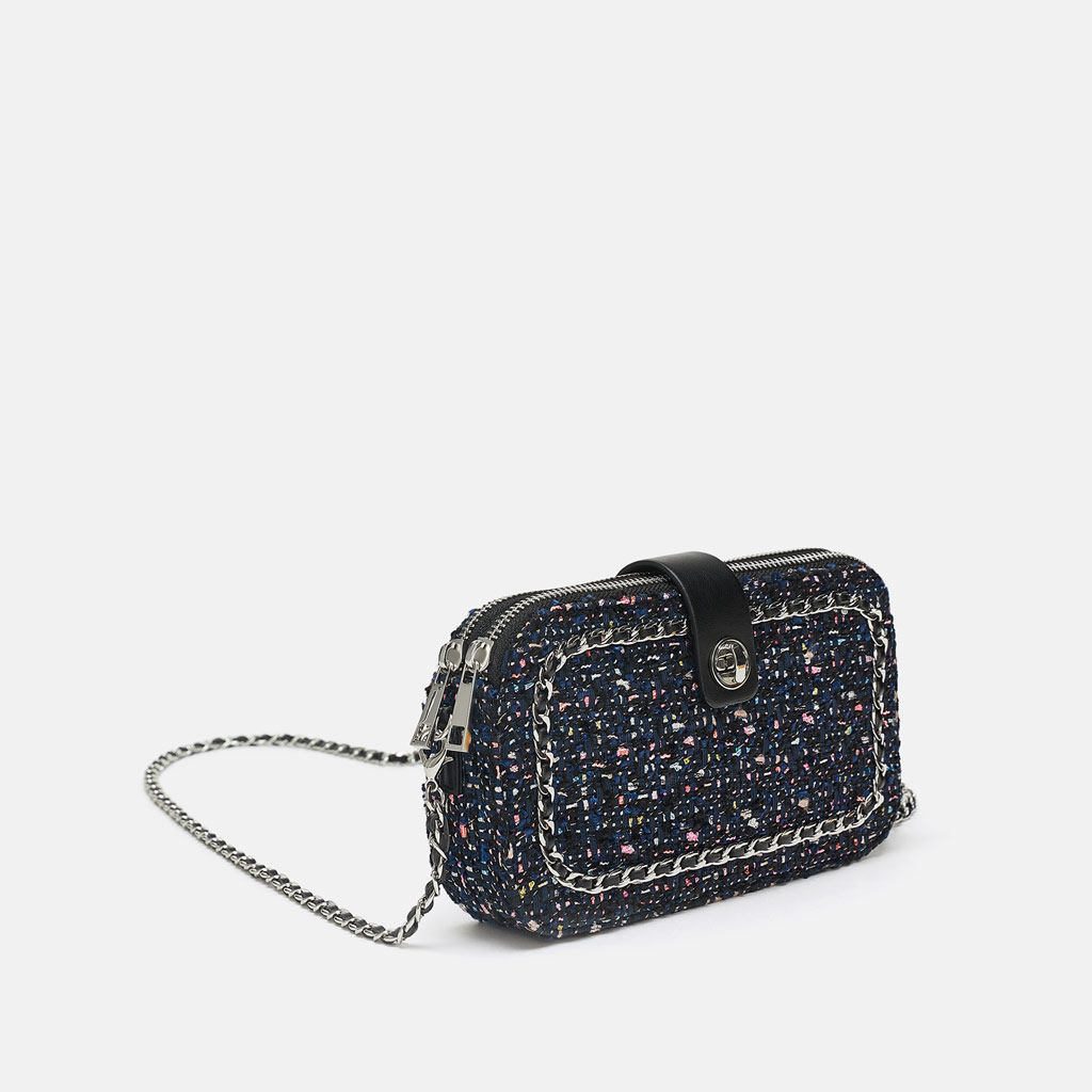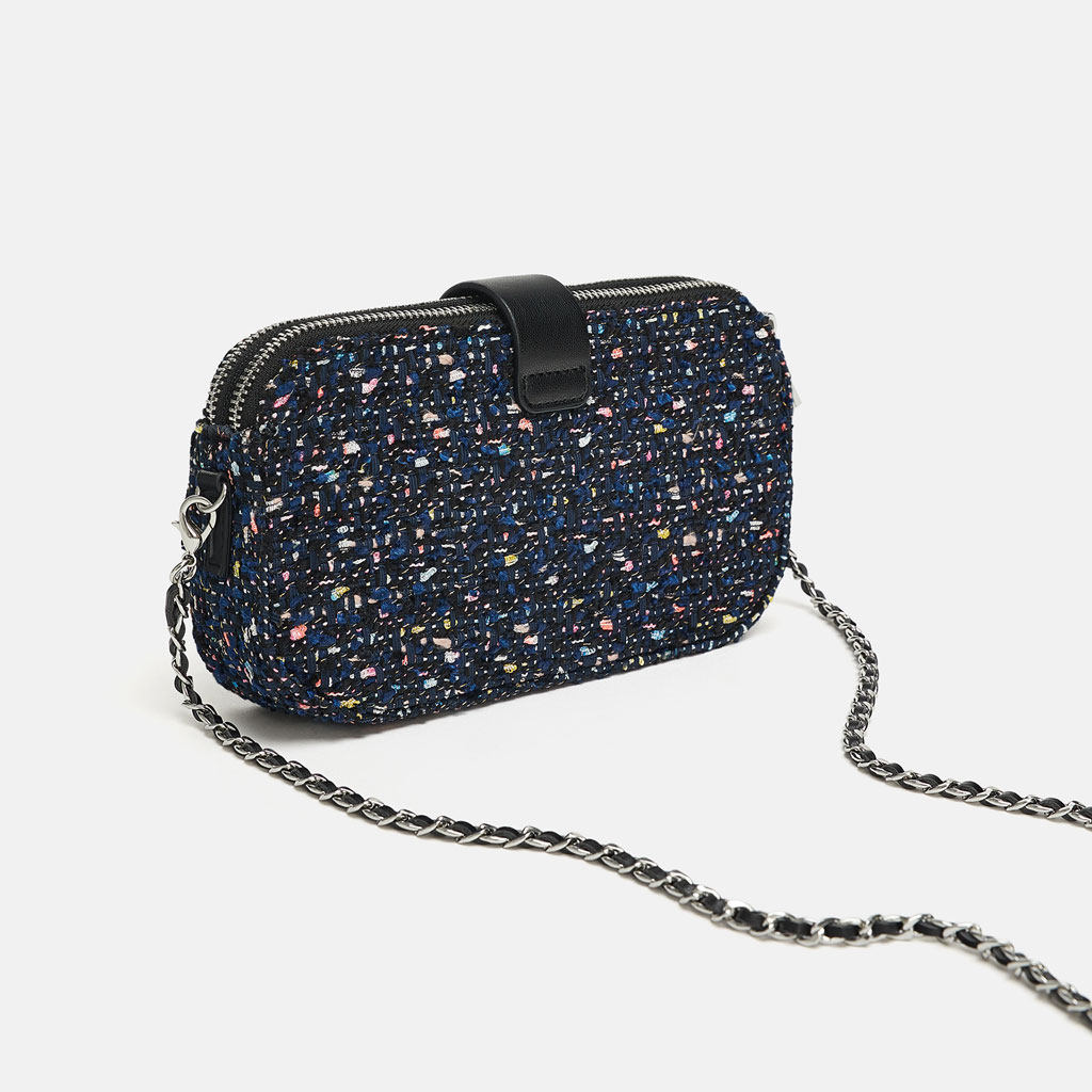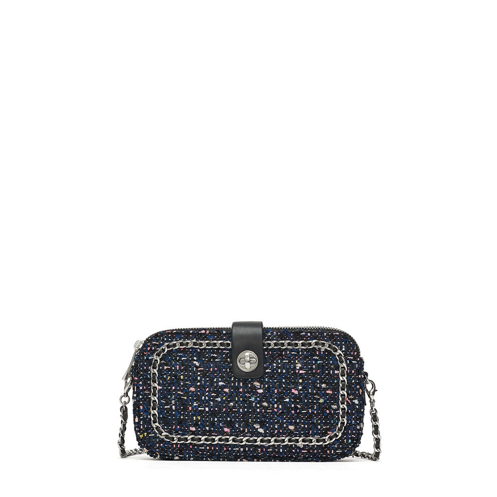 多色钱包式斜挎包。正面饰有链条。亮光斜纹软呢拼接裁剪。银色涂层金属装饰。包内设两个隔层,其中一个设有 4 个存放卡片的夹层。可拆肩带。以镶有金属饰件的带饰和拉链闭合。