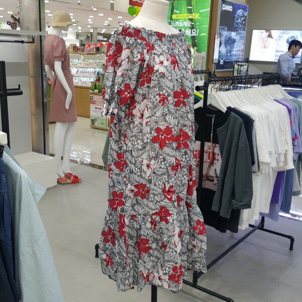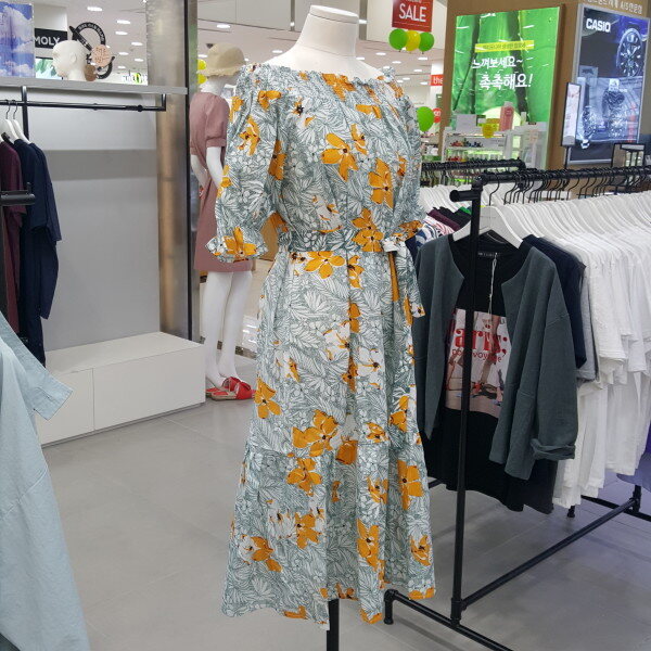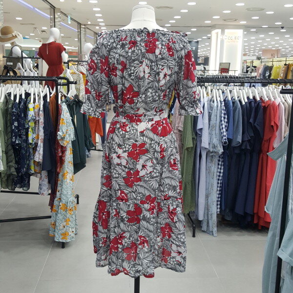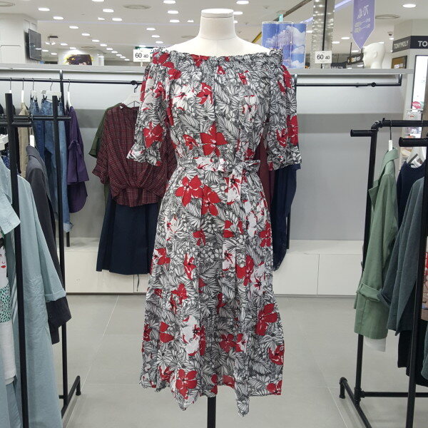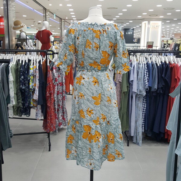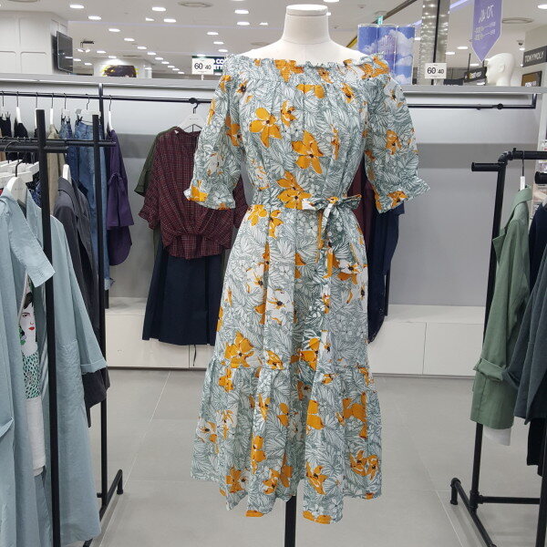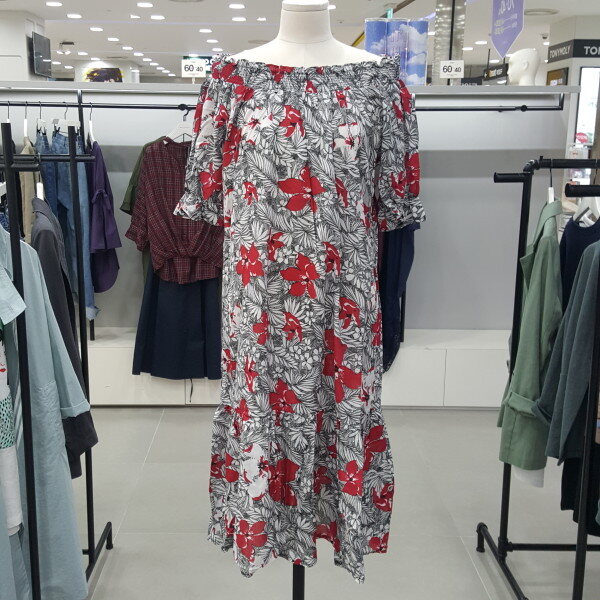 플라워패턴이 청량함을 더해주는 오프숄더 디자인이비니다여성스러운 느낌을 드리며 무난하게 라운드로 착용하실수 도 있습니다 여유있게 끈 없이 착용도 가능합니다프리사이즈 총길이100가슴둘레114