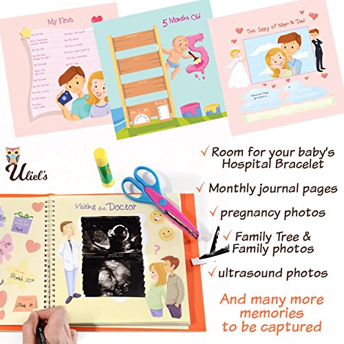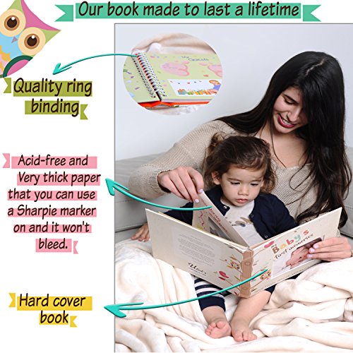 Memory book features super cute design with pretty pages you'll enjoy writing on.such as All About Mommy/Daddy; How Mom and Dad Met; family tree; pregnancy memories; baby shower; Baby's World; On the way; Here I am; baby's firsts; growth records; memories and birthdays; My world; My Favorites; My First Day of School.