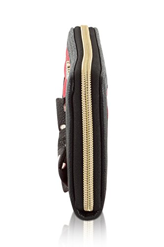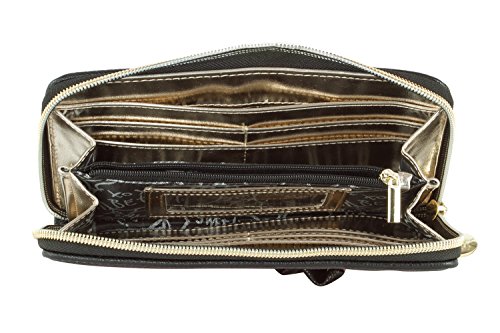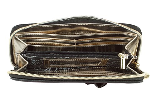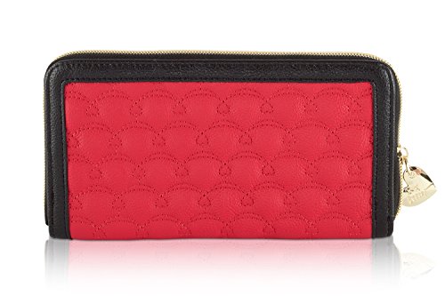 -. Feature : Zip around compartment, Front bow embellishment / PVC heart scallope quilted exterior, Betsey signature logo / Fully lined goldy metallic interior, Features: 8 credit cards slots / 2 currency pockets, center divider coin zip pocket and ID window / Packaged in a Signature gift box, Wallet Measures: 8"x 4"x 1" Inches (WxHxD)