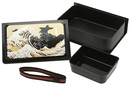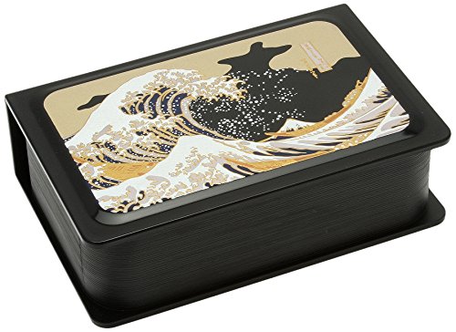 Take a meal to school or work using this fun, functional bento box. The box is designed to resemble a book, with the famous Kanagawa Wave print on the front. The removable lid, which is the front cover of the book bento, has a rubber gasket around it to prevent spills. The box includes a small removable insert to keep foods separate. The clever design allows the bento box to be stored upright, like a book. This box can also be used for storage of jewelry or small keepsakes. Made in Japan.