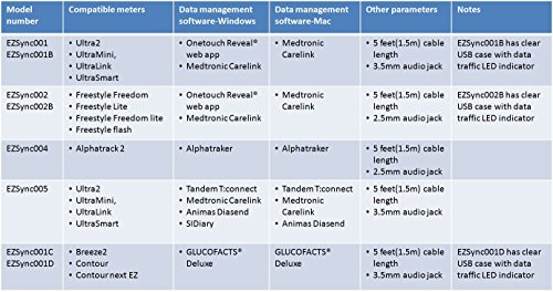 EZSync data cable(5 feet length) designed for a variety of Onetouch® glucose meters. Hard over-molded plastic on both ends, cable itself has reinforced stress points, durable but flexible. One year manufacturer warranty, three month no hassle return and full refund.
