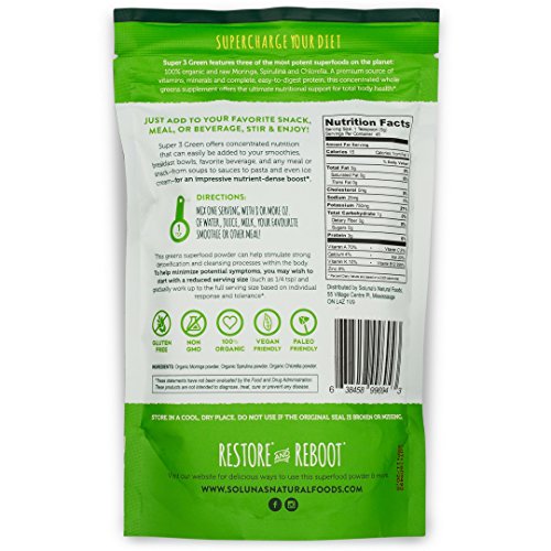 -. Feature : Featuring three organic green superfoods; Moringa, Spirulina, and Chlorella, that are bursting with vitamins, minerals, and amino acids to support total body health. / This nutrient-dense synergistic formula contains complete easy-to-digest protein sourced from three of the most potent superfoods on the planet. / Non-Gmo, raw, contains no soy, dairy, wheat, or gluten and is Vegan and Paleo approved. / 100% Pure & Natural. Made with organic ingredients of the highest quality. Contains no chemical additives, flavorings, or sweeteners. / Mix one serving of Super 3 Green superfood mix with water, juice, milk, or your favorite smoothie. Easy to include in your daily diet.