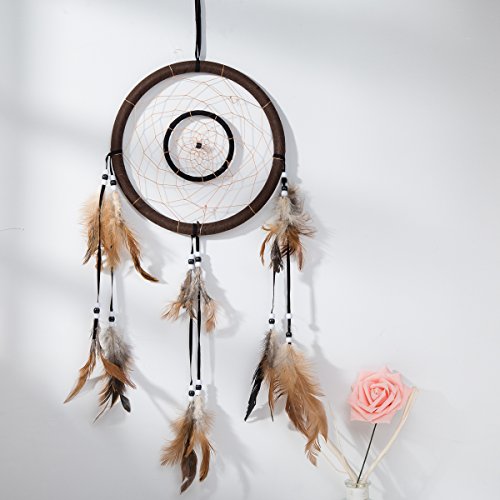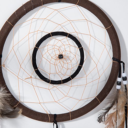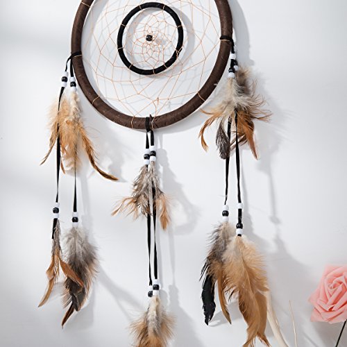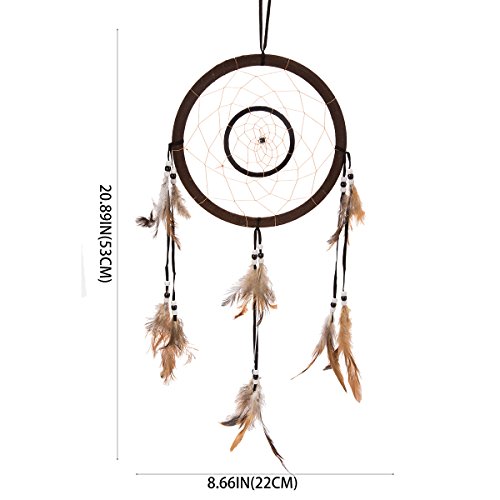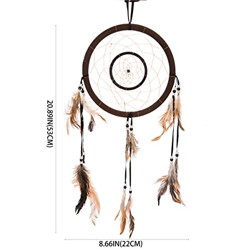 21" Traditional Brown Dream Catcher with Feathers Wall or Car Hanging Ornament Double Circles