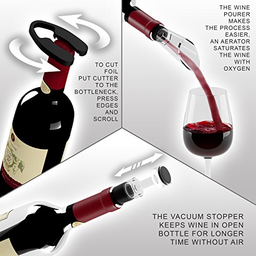 UncleViner set has a lot of useful items. Foil Cutter to remove the foil easily, Wine Pourer to make wine taste perfect by mixing it with air,