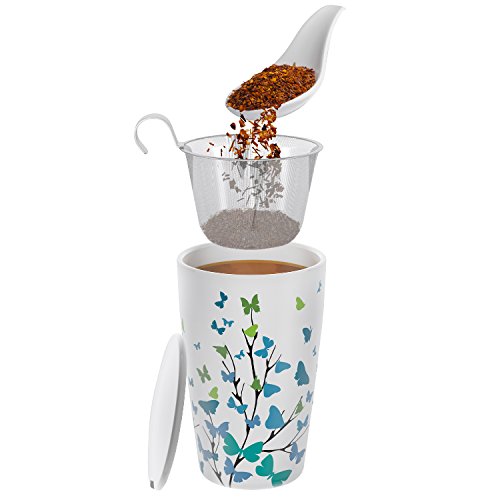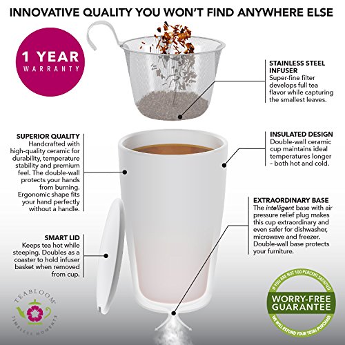 Teabloom BLOOMI Single Cup Loose Tea Brewing System makes the perfect cup of tea every single time. It has the innovative built-in features to let even the complete novice enjoy wonderful, full flavored tea. The ceramic cup has double walls that give you natural and very effective insulation. The cup keeps your drink hot or cold longer using this exclusive design. Beautiful Floral Painted Mug features a delightful, delicate design with a hint of Asian artistic tradition. The look goes well with any decor and color combinations. It will fit well with your other cups giving you a pleasing, attractive collection you will use over and over again. Includes Integrated Stainless Steel Infuser that lets you get the full flavor of your favorite teas. Less waste as you can use even the smallest tea leaves. Prevents "dusty" tea and gives you a premium experience every time with less effort and mess. This infuser is easy to wash and won't rust, corrode, or harbor bacteria. Ceramic Lid Doubles as Coaster is built just right so you can rest the infuser basket on the lid after steeping. Mug and lid can be used safely in the microwave, and all parts of this product are dishwasher-safe. Note the pressure adjustment plug at the bottom that equalizes the air pressure between the two layers. 100% Money Back Guarantee ensures this will be your best bet for a no-risk purchase. Many customers love this mug so much they return to buy several more. This makes a much appreciated gift for friends, family, and co-workers. Buy 2 or more Teabloom Products and receive 10% OFF with coupon code: TEABLOOM. We recommend bundling this mug with the Teabloom Flowering Teas (2-pack) to make this gift even more special and memorable. 0 |