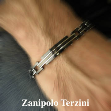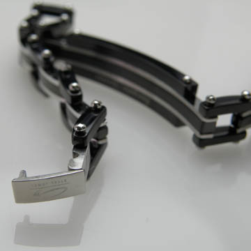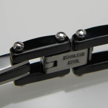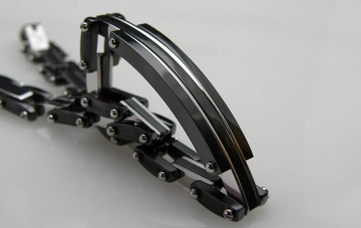 ブラックコーティングされたパーツを組み合わせたチェーンブレス。サイドのビスデザインが特徴的。ステンレスはシルバーのようにロウ付け加工が出来ないためひとつひとつのパーツをねじで止めて組み合わせていきます。このブレスはそんなステンレスの特徴をいかした仕上がりになっています☆まるでレゴを思い出すような遊び心満載のビスデザインは特に男性からの支持がすごく高いです☆