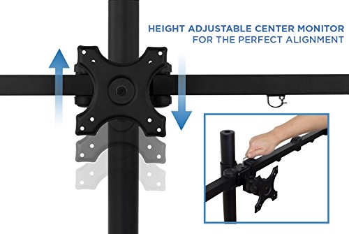 FULLY ADJUSTABLE - Triple arms are height adjustable on the vertical pole. Side arms can articulate in three different locations for best positioning of the screens. Each monitor can tilt up or down 15 degrees and rotate 360 degrees. Side monitors can swivel 360 degrees. Rotating the monitor holders allows landscape or portrait positioning. No need to remove the monitors to change positions.