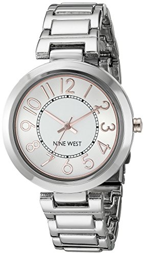 For a versatile timepiece, choose the Nine West Silvertone Easy Reader Bracelet Watch. Its sleek round case and linked bracelet are finished in striking silvertone to ensure the watch works well with both casual and dressy wardrobe pieces. Large Arabic numbers are easy to see and rose goldtone touches add a luxe look to the design. Freshen up your look with this women's watch.Feature
