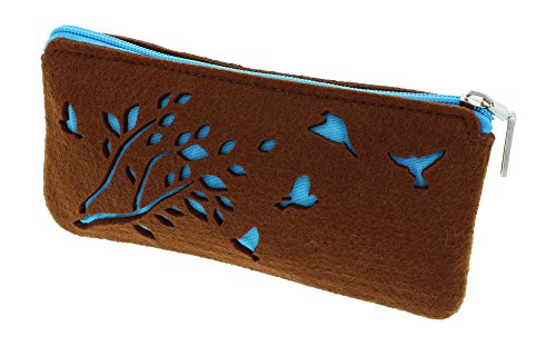 Brown felt pouch is laser cut with a charming nature scene in aqua featuring a tree branch and several small birds flitting about