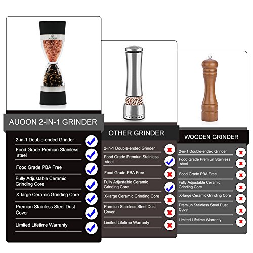 - SAVING SPACE AND CONVENIENT:2 in 1 design, you don't need to prepare two grinders for salt and pepper. It could reduce clutter on your dinner table with this dual chambered design.
