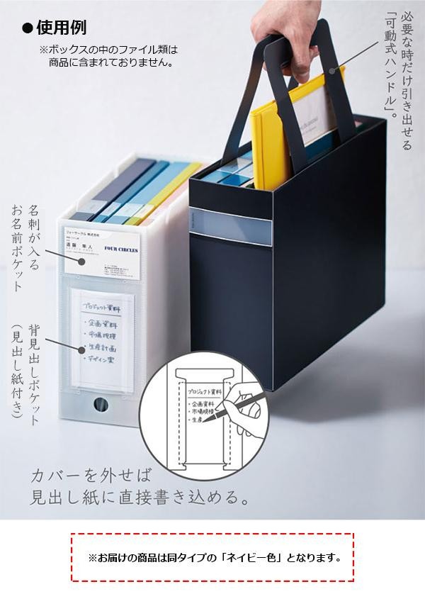 | 色も機能も「使い勝手」にこだわったフェイバリッツシリーズのボックスファイルです。組立不要でしっかり自立。必要な時だけ引き出せる「可動式ハンドル」付きで持ち運びにもとっても便利です。キッチンツール・調味料の収納など、ご家庭でもご使用いただけます。 |