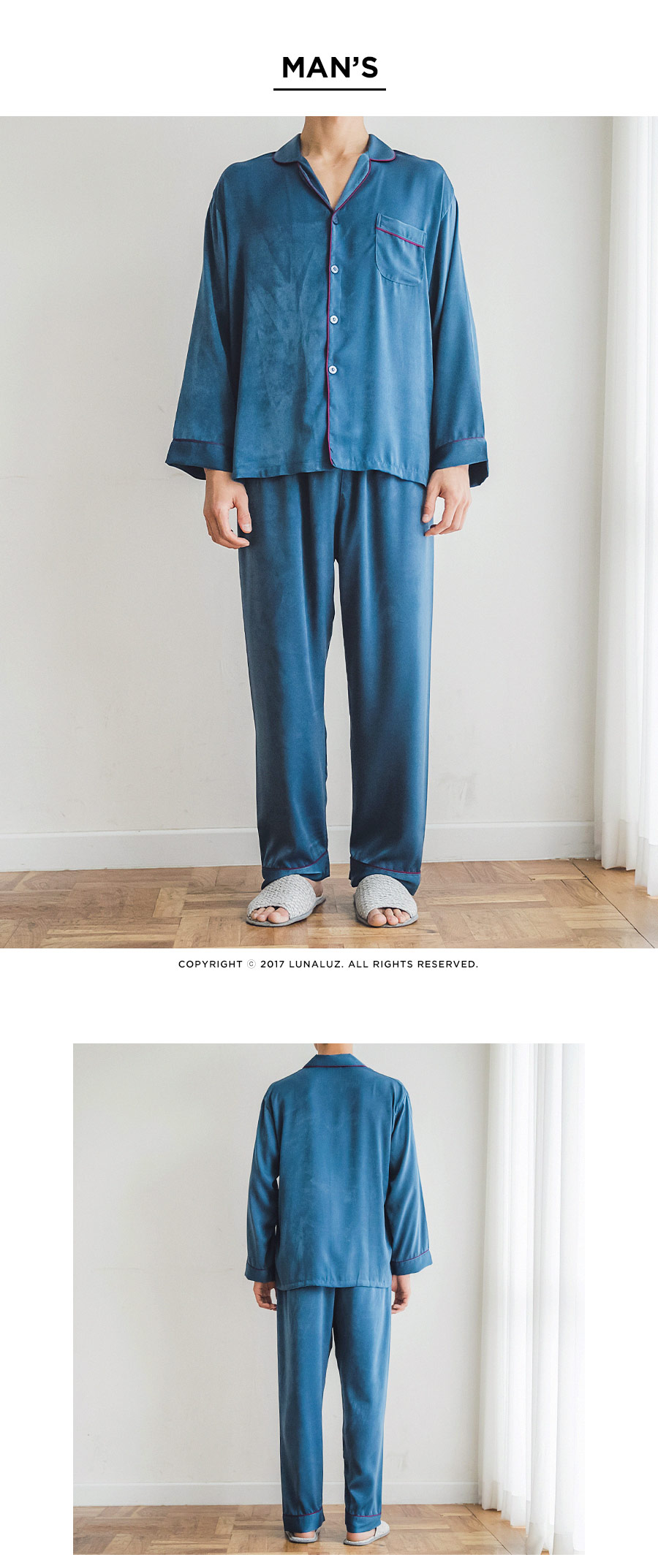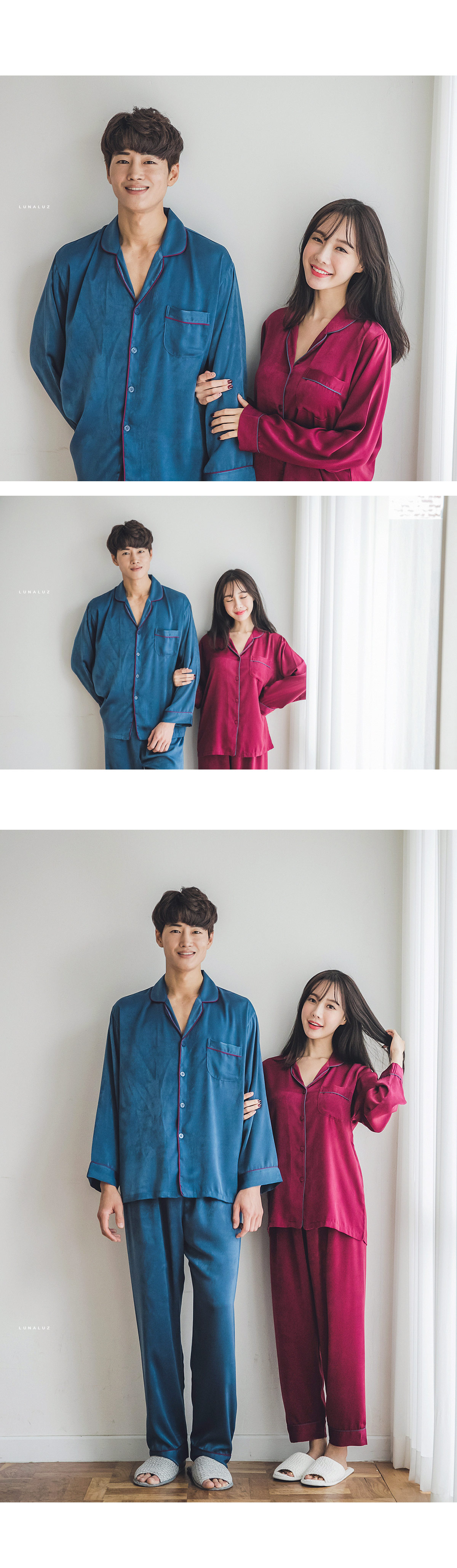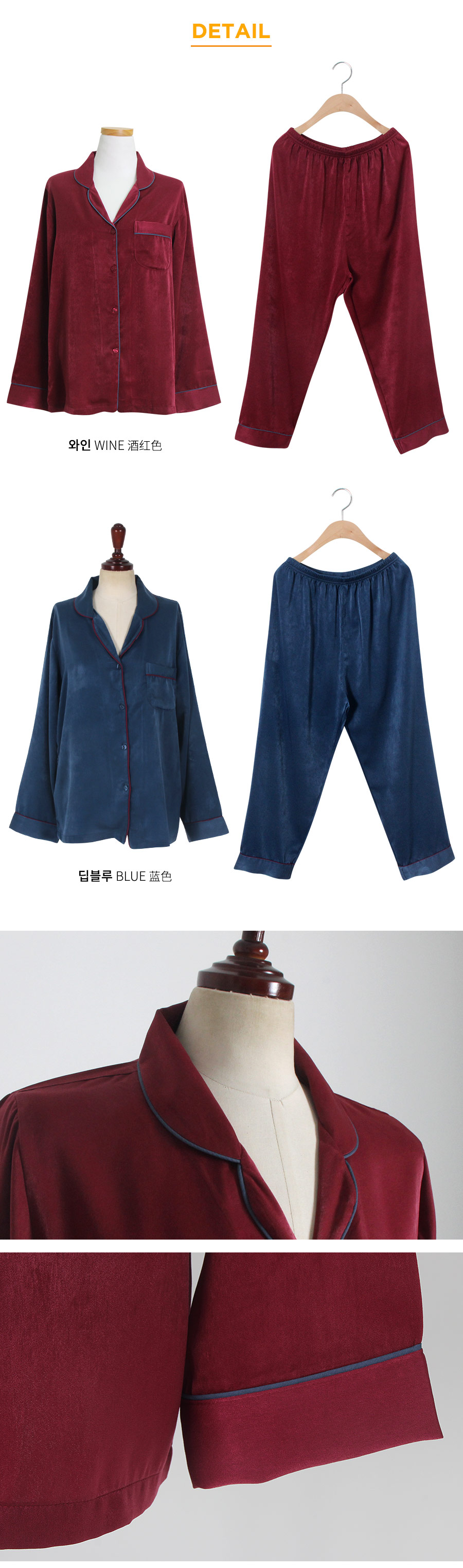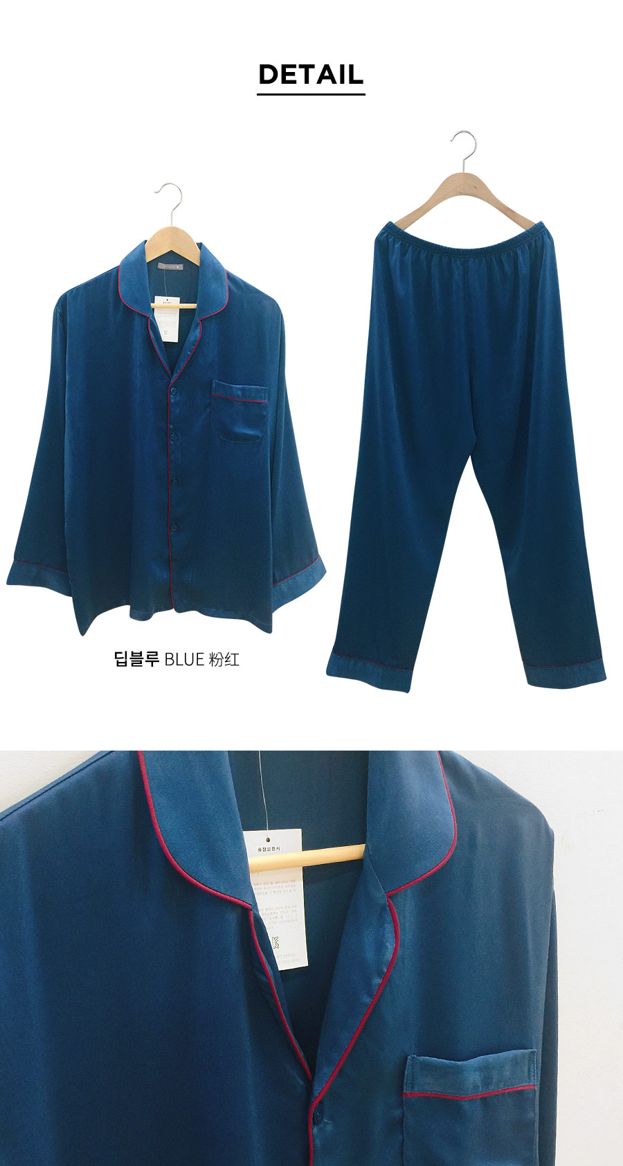 빛에 따라 감도는 고급스러운 워싱 표면이 만족도를 더 높여 줄 거에요~! 광택이 도는 소재가 아닌 고급스러운 윤기가 흐르는 네츄럴한 느낌의 원단이랍니다. 피부에 닿는 터칭감이 굉장히 좋고, 부드럽게 하늘거리는 소재감이 실루엣을 더 예쁘게 살려줍니다. DETAIL파이핑을 카라부터 클로징 부분까지 봉제하여 포인트를 주었습니다. 까다로운 소재로 고난위도의 봉제와 공정이 들어간 잠옷이랍니다. 심플한 스타일의 디자인으로 매 해 질리지 않고, 계속해서 손이 갈 잠옷입니다. 손목과 팬츠의 하단에도 파이핑으로 포인트를 주었습니다. 여성 잠옷의 컬러는 매력적인 와인, 단정한 딥블루 2가지로 염색하여 제작하였습니다. 남성 잠옷의 컬러는 딥블루 한 가지로 제작했습니다. 원단과 동일한 컬러의 버튼을 제작해 마감했습니다. 어디에서도 보지 못한 컬러, 고급스러운 소재를 느껴보세요. 100% 국내 생산으로 봉제와 소재 마감이 깔끔하고 퀄리티가 높아 선물로도 강력 추천해드려요. SIZE여성 잠옷은 44반~66반 size까지 커버 가능한 free 사이즈 입니다.
