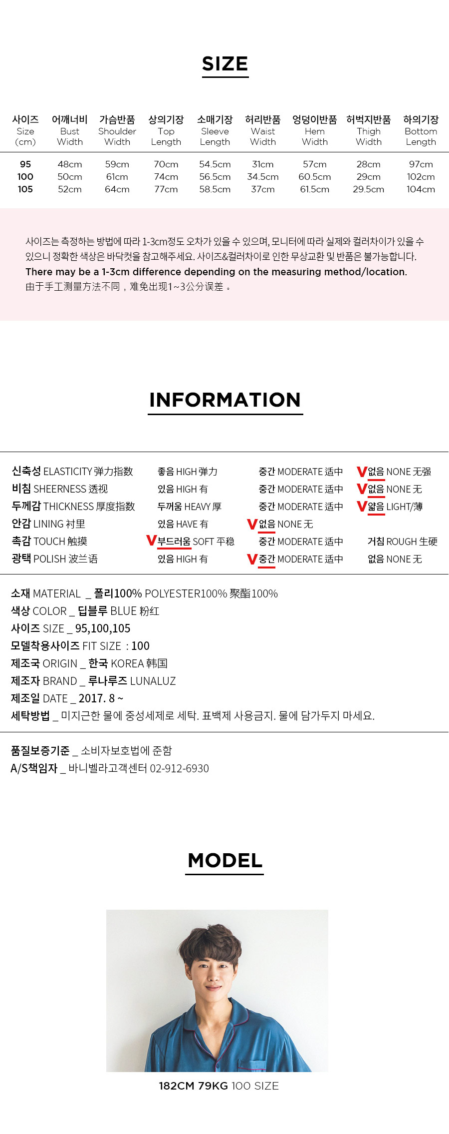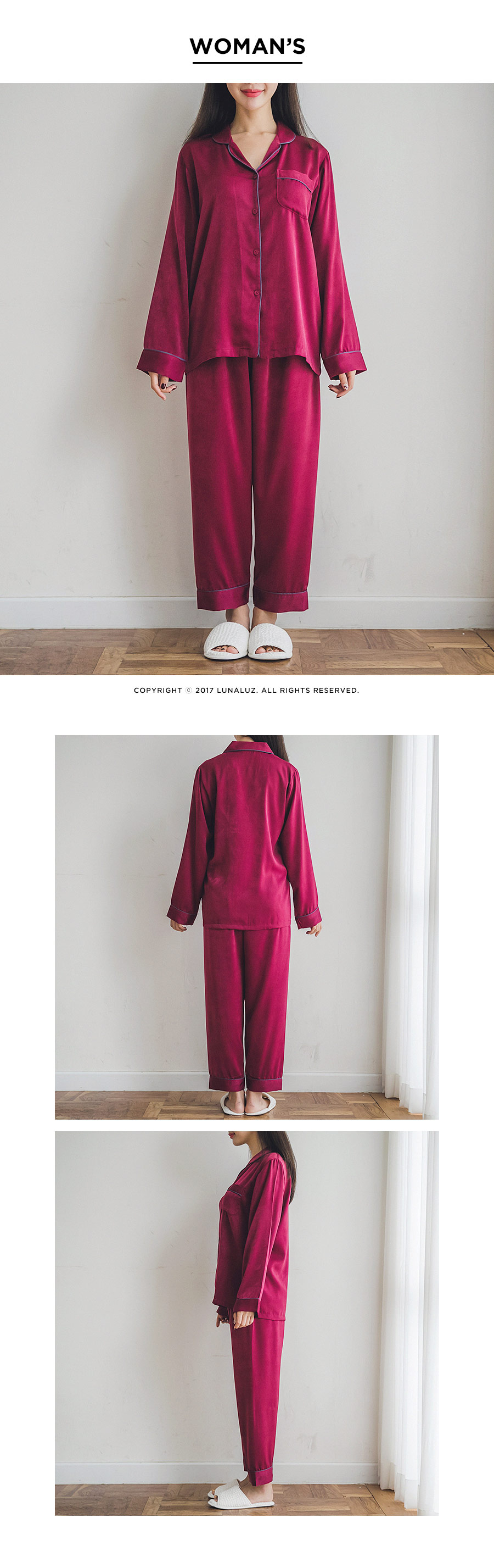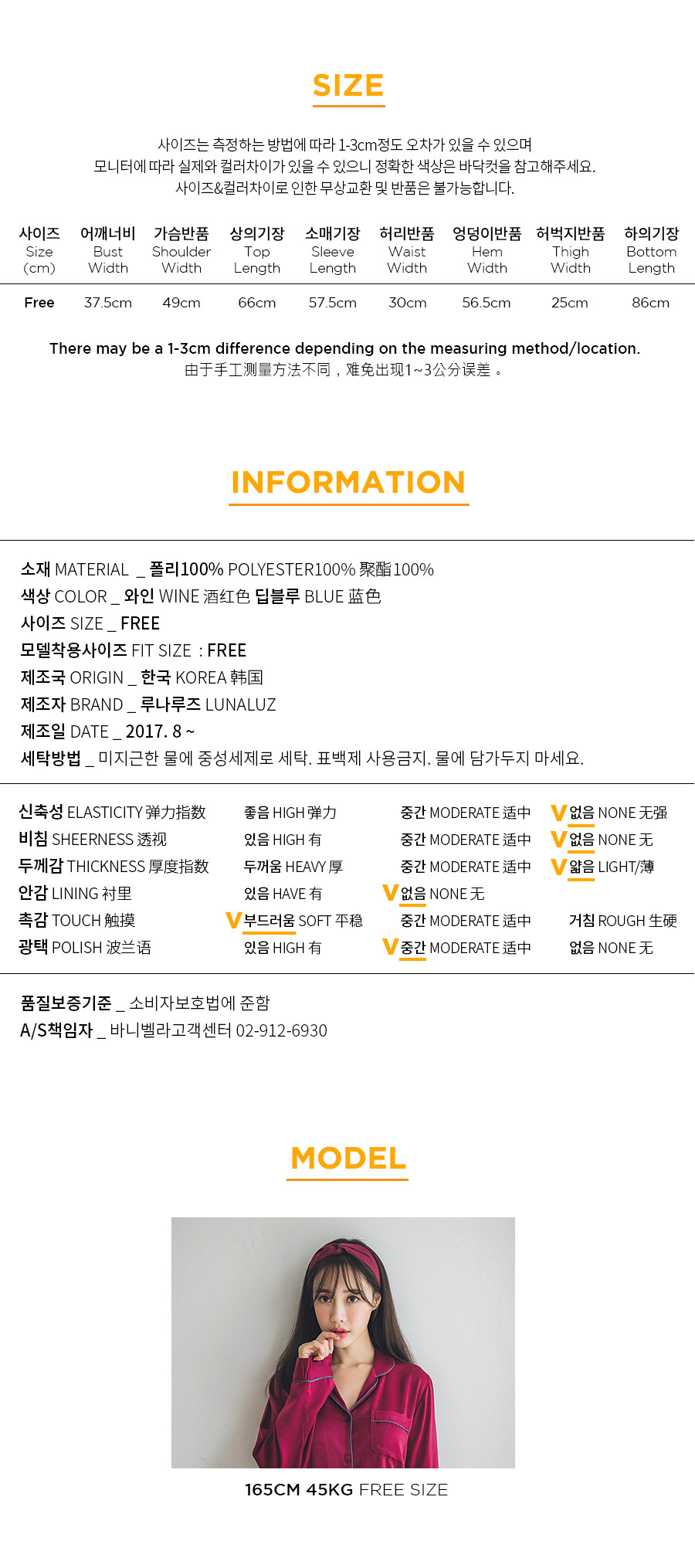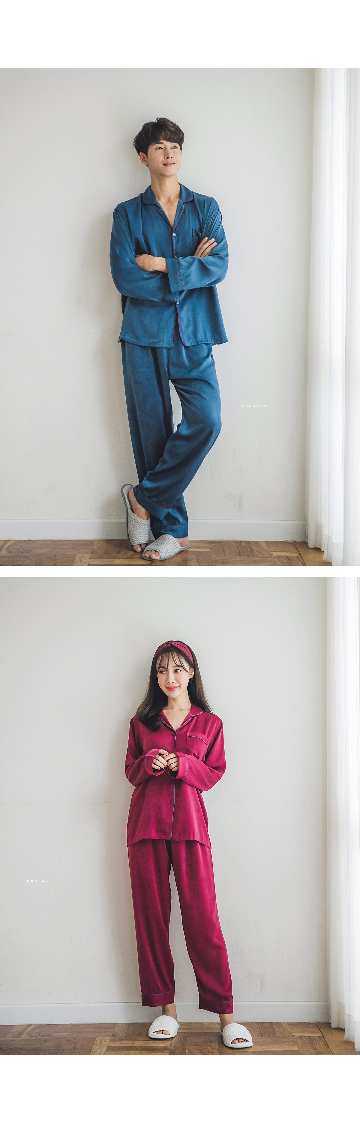 빛에 따라 감도는 고급스러운 워싱 표면이 만족도를 더 높여 줄 거에요~! 광택이 도는 소재가 아닌 고급스러운 윤기가 흐르는 네츄럴한 느낌의 원단이랍니다. 피부에 닿는 터칭감이 굉장히 좋고, 부드럽게 하늘거리는 소재감이 실루엣을 더 예쁘게 살려줍니다. DETAIL파이핑을 카라부터 클로징 부분까지 봉제하여 포인트를 주었습니다. 까다로운 소재로 고난위도의 봉제와 공정이 들어간 잠옷이랍니다. 심플한 스타일의 디자인으로 매 해 질리지 않고, 계속해서 손이 갈 잠옷입니다. 손목과 팬츠의 하단에도 파이핑으로 포인트를 주었습니다. 여성 잠옷의 컬러는 매력적인 와인, 단정한 딥블루 2가지로 염색하여 제작하였습니다. 남성 잠옷의 컬러는 딥블루 한 가지로 제작했습니다. 원단과 동일한 컬러의 버튼을 제작해 마감했습니다. 어디에서도 보지 못한 컬러, 고급스러운 소재를 느껴보세요. 100% 국내 생산으로 봉제와 소재 마감이 깔끔하고 퀄리티가 높아 선물로도 강력 추천해드려요. SIZE여성 잠옷은 44반~66반 size까지 커버 가능한 free 사이즈 입니다.