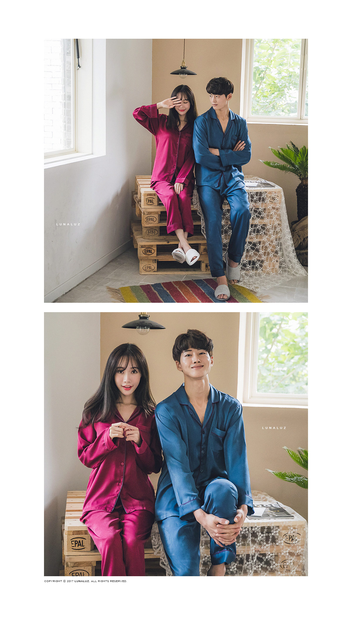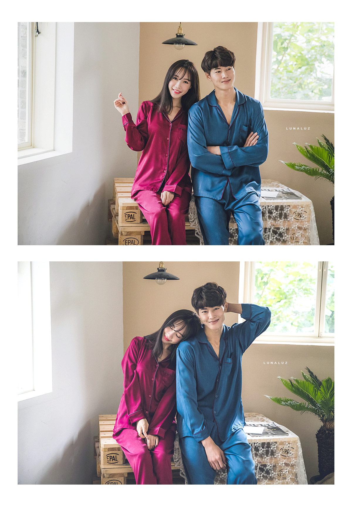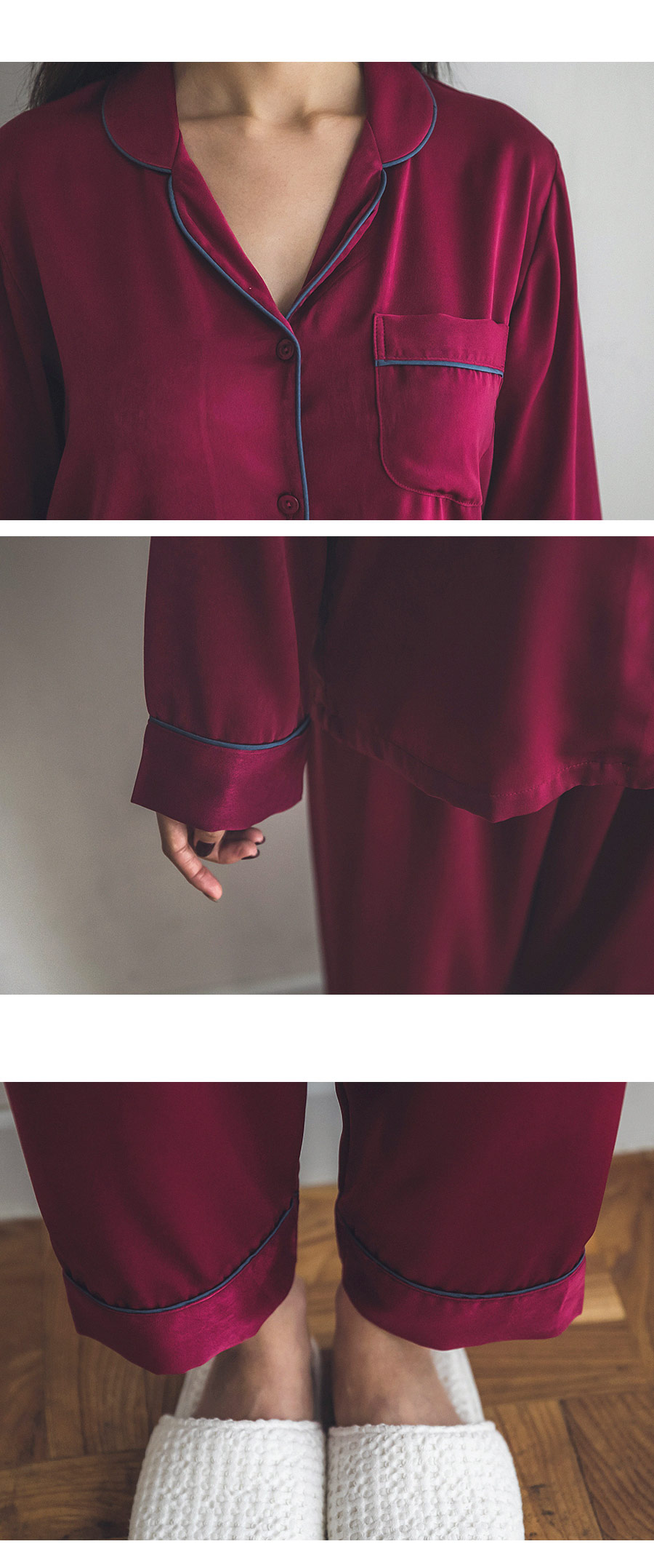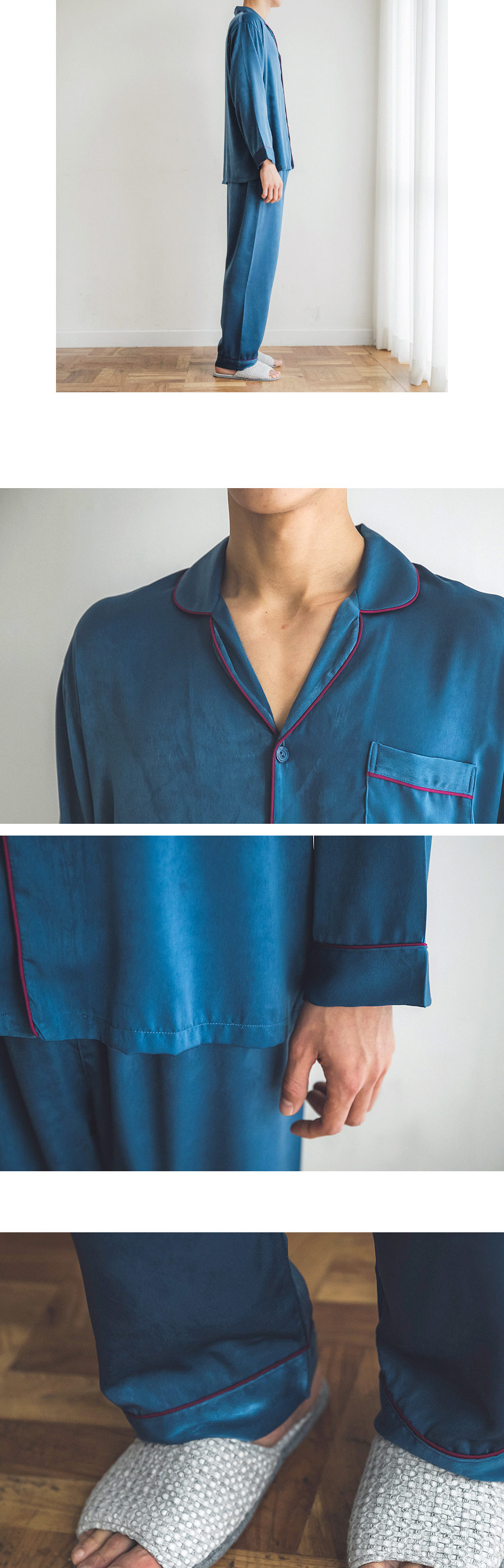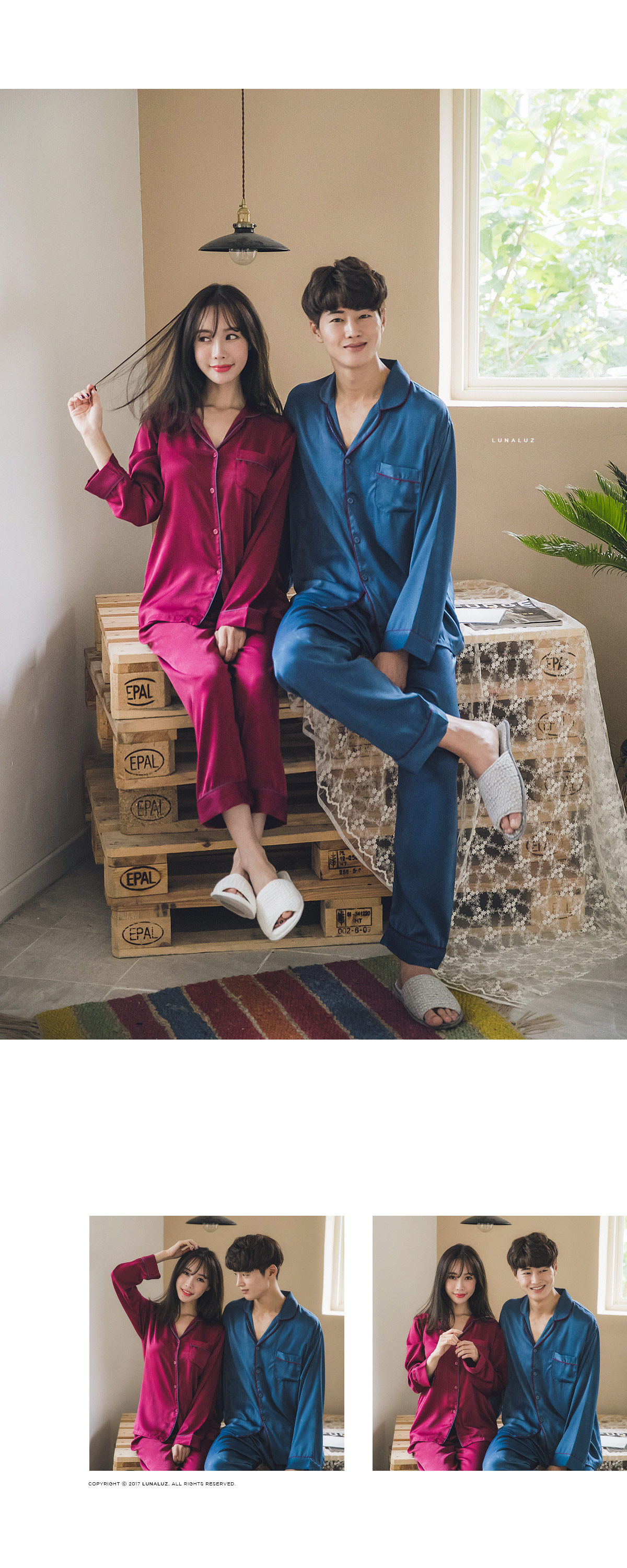 빛에 따라 감도는 고급스러운 워싱 표면이 만족도를 더 높여 줄 거에요~! 광택이 도는 소재가 아닌 고급스러운 윤기가 흐르는 네츄럴한 느낌의 원단이랍니다. 피부에 닿는 터칭감이 굉장히 좋고, 부드럽게 하늘거리는 소재감이 실루엣을 더 예쁘게 살려줍니다. DETAIL파이핑을 카라부터 클로징 부분까지 봉제하여 포인트를 주었습니다. 까다로운 소재로 고난위도의 봉제와 공정이 들어간 잠옷이랍니다. 심플한 스타일의 디자인으로 매 해 질리지 않고, 계속해서 손이 갈 잠옷입니다. 손목과 팬츠의 하단에도 파이핑으로 포인트를 주었습니다. 여성 잠옷의 컬러는 매력적인 와인, 단정한 딥블루 2가지로 염색하여 제작하였습니다. 남성 잠옷의 컬러는 딥블루 한 가지로 제작했습니다. 원단과 동일한 컬러의 버튼을 제작해 마감했습니다. 어디에서도 보지 못한 컬러, 고급스러운 소재를 느껴보세요. 100% 국내 생산으로 봉제와 소재 마감이 깔끔하고 퀄리티가 높아 선물로도 강력 추천해드려요. SIZE여성 잠옷은 44반~66반 size까지 커버 가능한 free 사이즈 입니다.