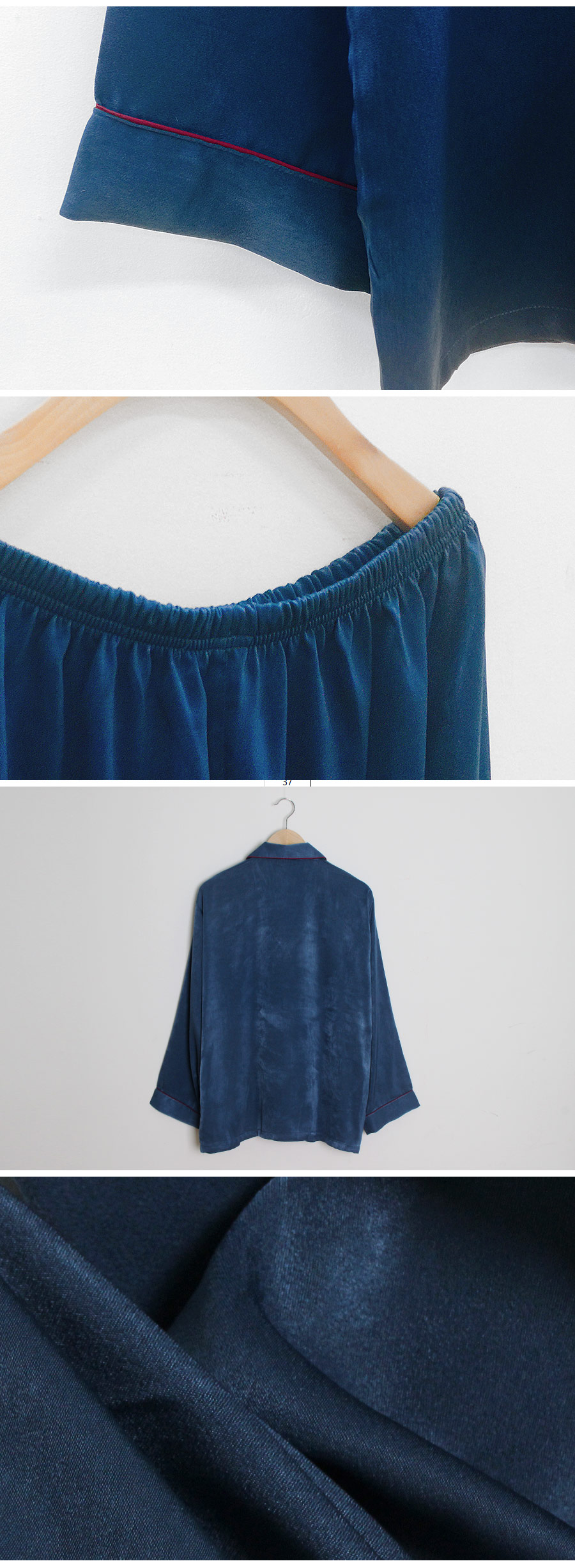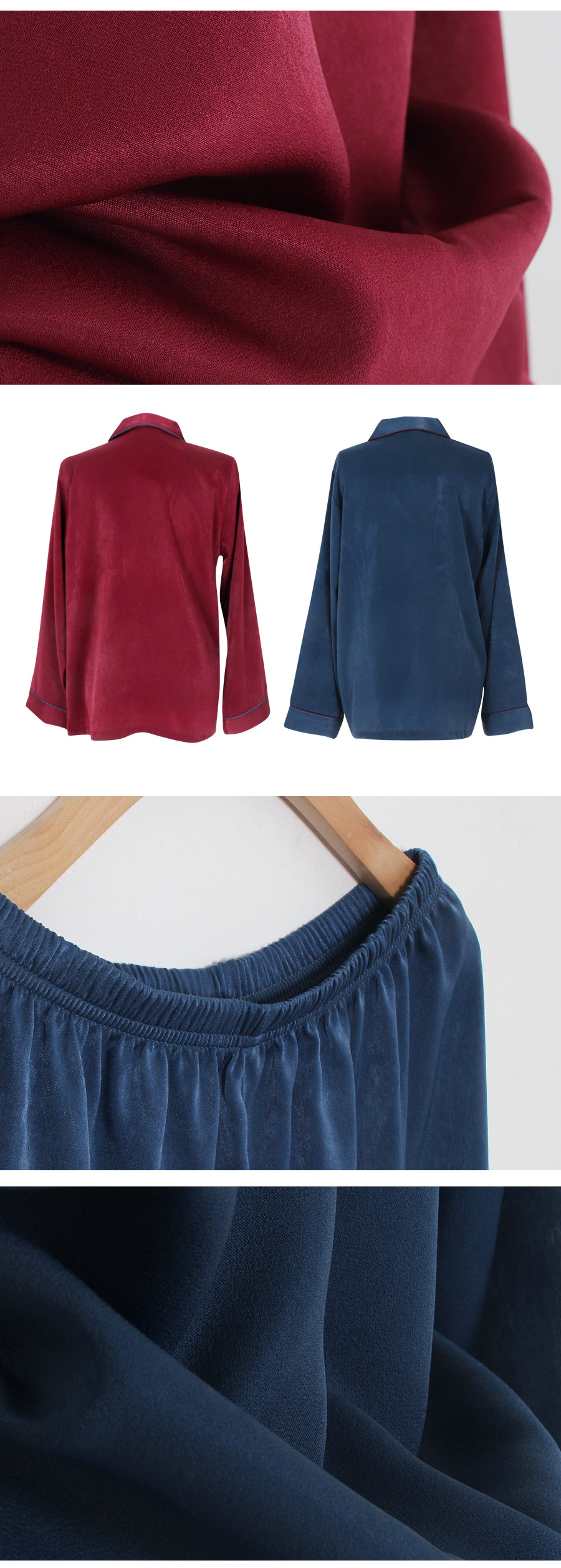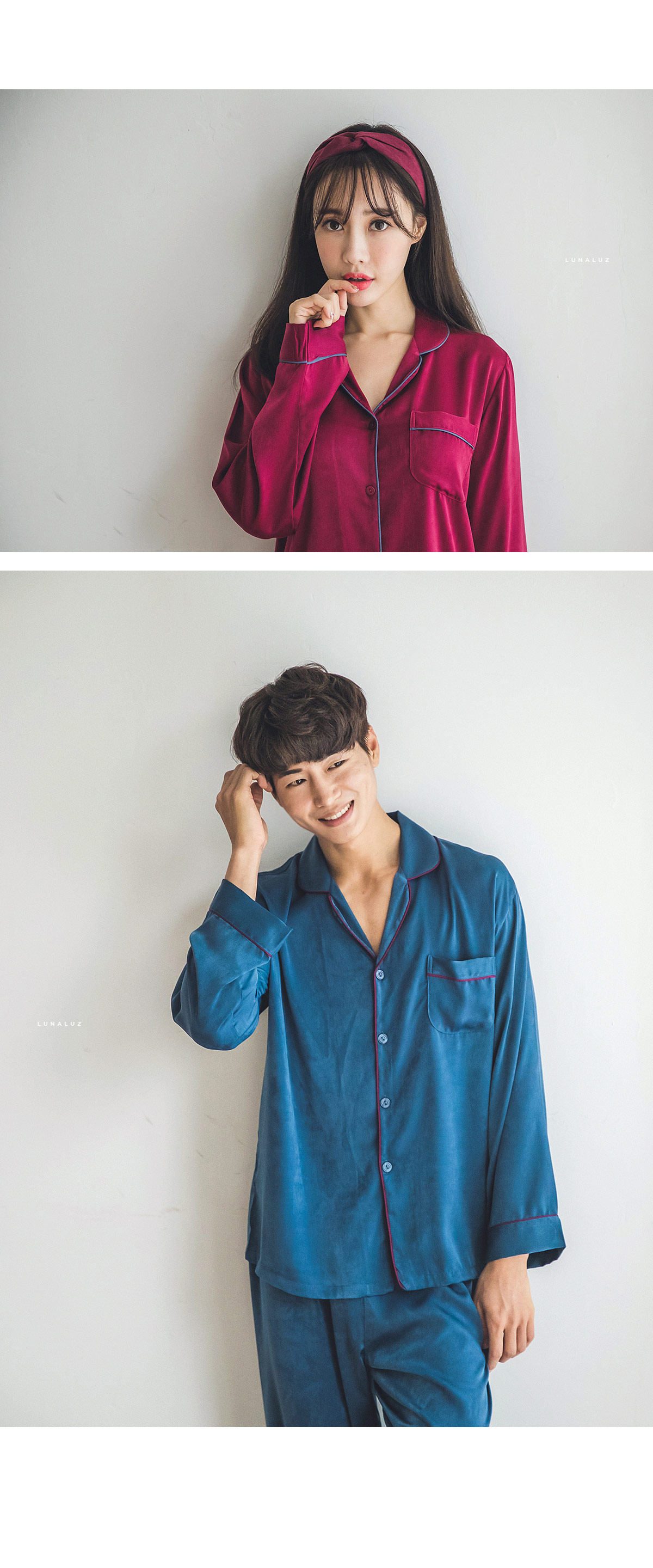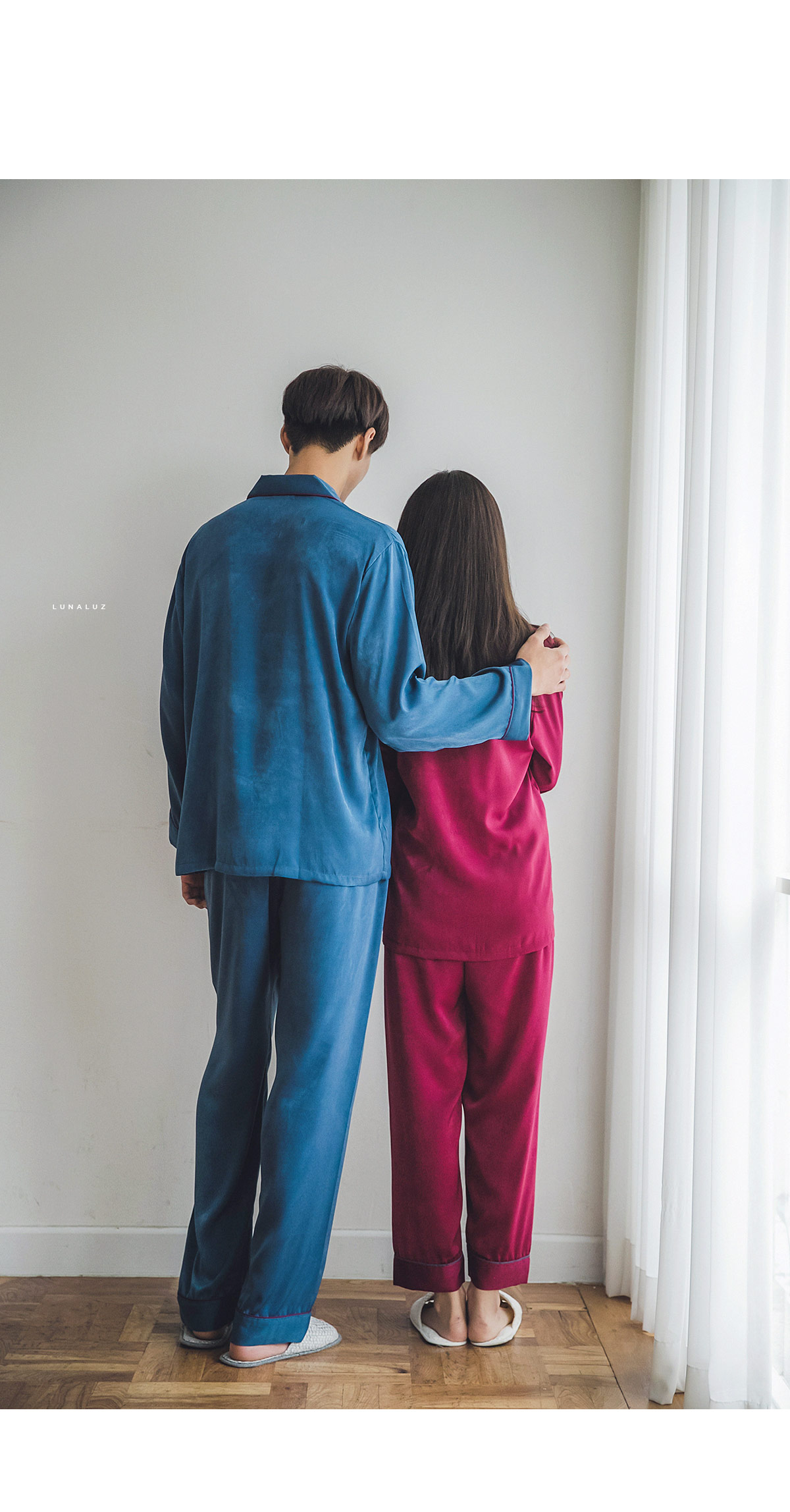 빛에 따라 감도는 고급스러운 워싱 표면이 만족도를 더 높여 줄 거에요~! 광택이 도는 소재가 아닌 고급스러운 윤기가 흐르는 네츄럴한 느낌의 원단이랍니다. 피부에 닿는 터칭감이 굉장히 좋고, 부드럽게 하늘거리는 소재감이 실루엣을 더 예쁘게 살려줍니다. DETAIL파이핑을 카라부터 클로징 부분까지 봉제하여 포인트를 주었습니다. 까다로운 소재로 고난위도의 봉제와 공정이 들어간 잠옷이랍니다. 심플한 스타일의 디자인으로 매 해 질리지 않고, 계속해서 손이 갈 잠옷입니다. 손목과 팬츠의 하단에도 파이핑으로 포인트를 주었습니다. 여성 잠옷의 컬러는 매력적인 와인, 단정한 딥블루 2가지로 염색하여 제작하였습니다. 남성 잠옷의 컬러는 딥블루 한 가지로 제작했습니다. 원단과 동일한 컬러의 버튼을 제작해 마감했습니다. 어디에서도 보지 못한 컬러, 고급스러운 소재를 느껴보세요. 100% 국내 생산으로 봉제와 소재 마감이 깔끔하고 퀄리티가 높아 선물로도 강력 추천해드려요. SIZE여성 잠옷은 44반~66반 size까지 커버 가능한 free 사이즈 입니다.