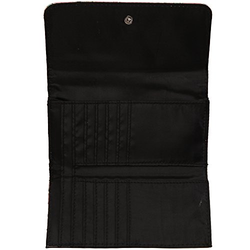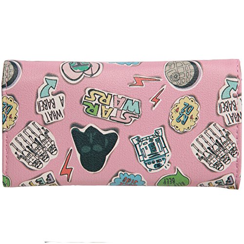This officially licensed Star Wars trifold wallet features small colored pencil sketches of various motifs from George Lucas' hit movies. The multi-colored drawings resemble notebook doodles pasted onto a pink material. The wallet also features a simple snap closure.Feature