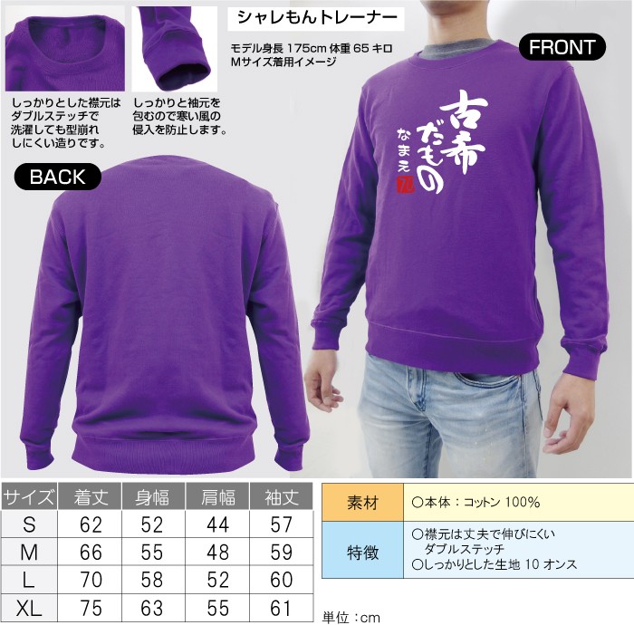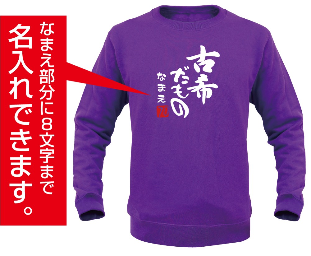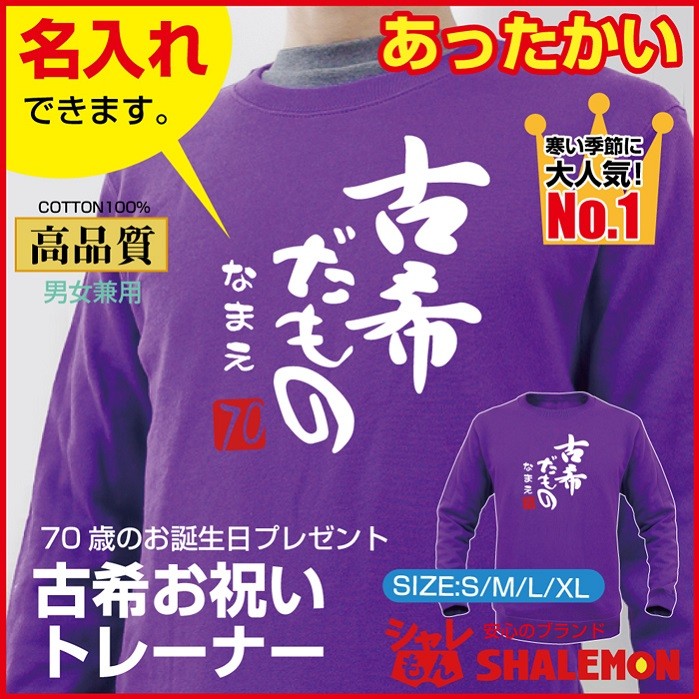 70歳のお誕生日のお祝いに「古希だもの」デザインが最高! シャレもんオリジナル古希祝い用【長袖】トレーナーです。 高品質でしっかりとした分厚い生地10オンスの紫トレーナーです。寒い季節の古希祝いはこのトレーナーを着て記念撮影がオススメ古希だものデザインは当店のオリジナルです、安心した品質の当店「シャレもん SHALEMON」でのご購入で是非どうぞ。お揃いの古希祝いパンツやタオル、帽子等もありますので、ご一緒にどぞ。古希祝いでなやんだら、シャレもん! お好きな文字を名入れします。白文字で書体は筆文字となります。 文字数は8文字(ひらがな・カタカナ・漢字)まで名入れいたします。 きっと、笑顔になる古希祝いはシャレもん!!