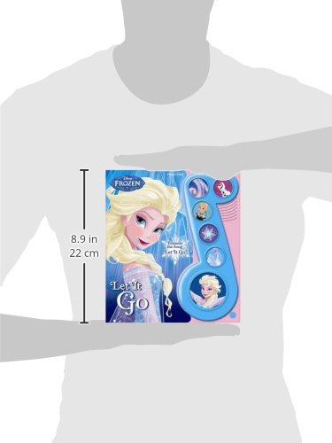 Partial lyrics to the hit song Let It Go from the Disney movie Frozen are printed throughout the book and illustrated with imagery from the movie. On each of the first four spreads, the child presses the matching button to hear the melody for the lyrics on that spread. On the final spread, the lyrics from all the previous spreads are printed, and the child presses the matching button to hear Elsa from the movie singing the song.Feature
