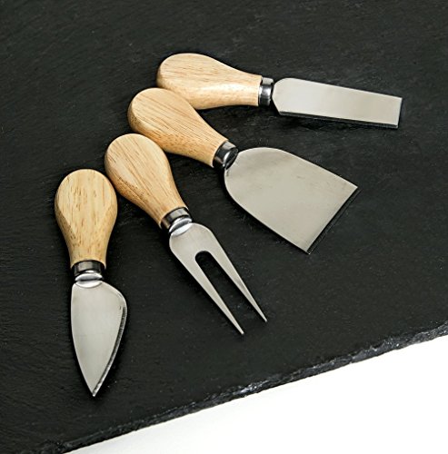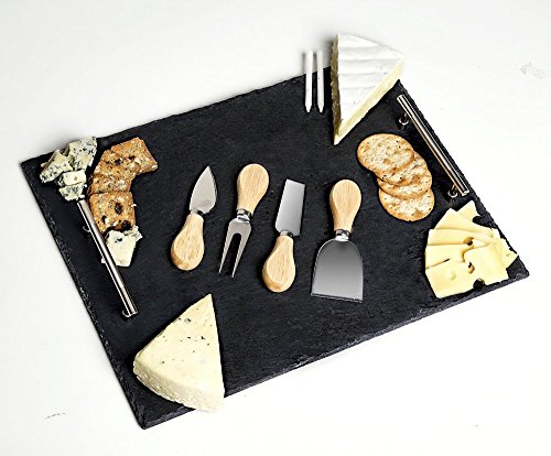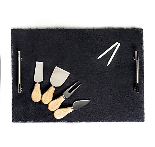INCLUDES 7 PIECES - Enjoy 1 premium slate board with stainless steel handles, 4 cheese knives, and 2 pieces soap stone chalk QUALITY CRAFTSMANSHIP - Hand cut slate stone smoothed and finished to perfection featuring premium stainless steel handles for easy mobility BONUS BUMPERS AND SOAPSTONE CHALK - Includes Non-slip Protective Foam Bumpers underneath the slate to prevent tabletop scratches and 2 high quality food-safe Soapstone Chalks for creative writing. PERFECT FOR ENTERTAINING - Versatile uses include serving cheeses, tapas, appetizers, hors d'oeuvres at your next party or casually around the houseFeature
