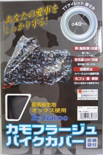 オックス150D生地を使用した迷彩柄のバイクカバーです。カバーの上からU字ロックやワイヤーロックが前後に取り付け可能。ワンタッチの風飛び防止ベルトを装備しています。 |