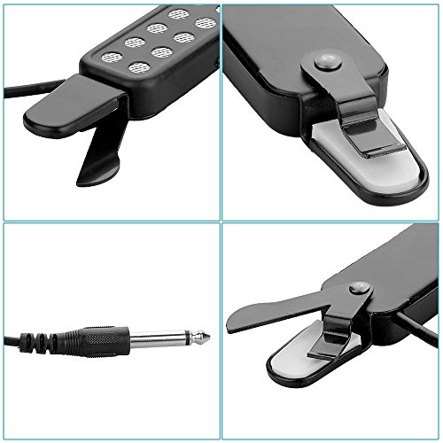 -. Feature : Mini appearance, with black metal material. / It is perfect for most acoustic guitars. / Padded clip guards against damaging to your guitar. / The pickup produces a clean quality sound and has low feedback.c / Convenient to use, easy to handle.
