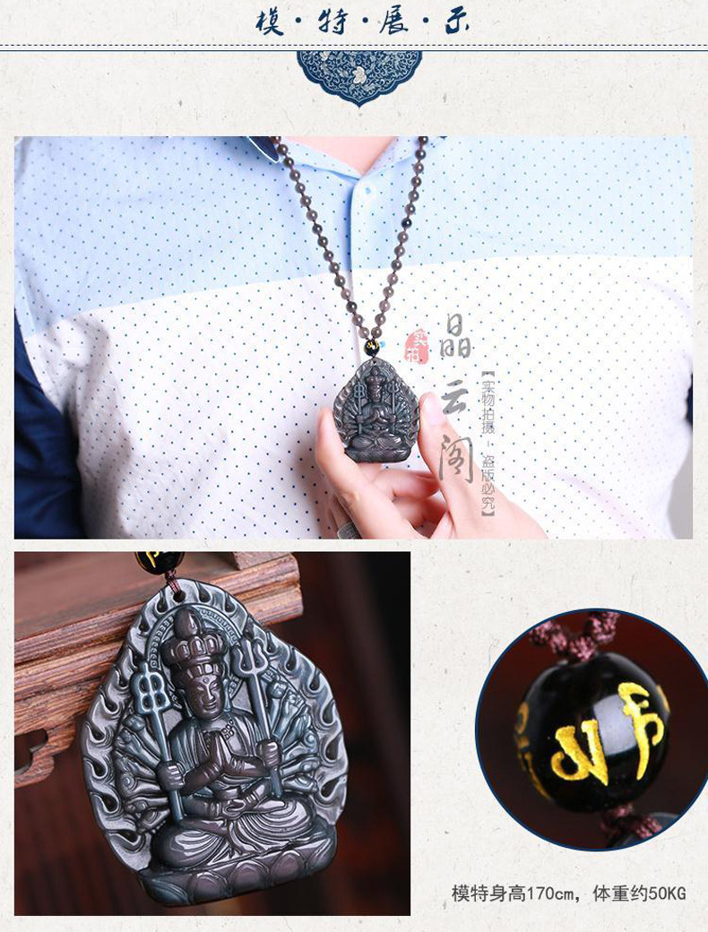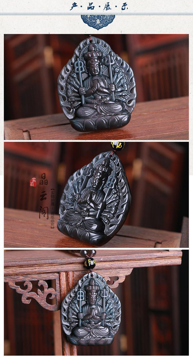 天然冰彩黑曜石千手观音菩萨吊坠男女项链生肖鼠守护神挂件