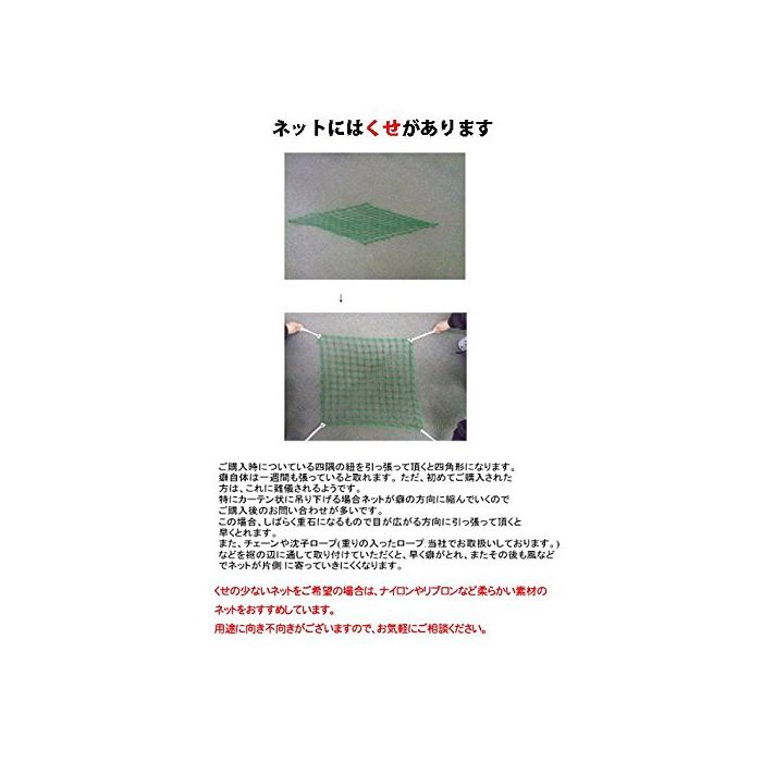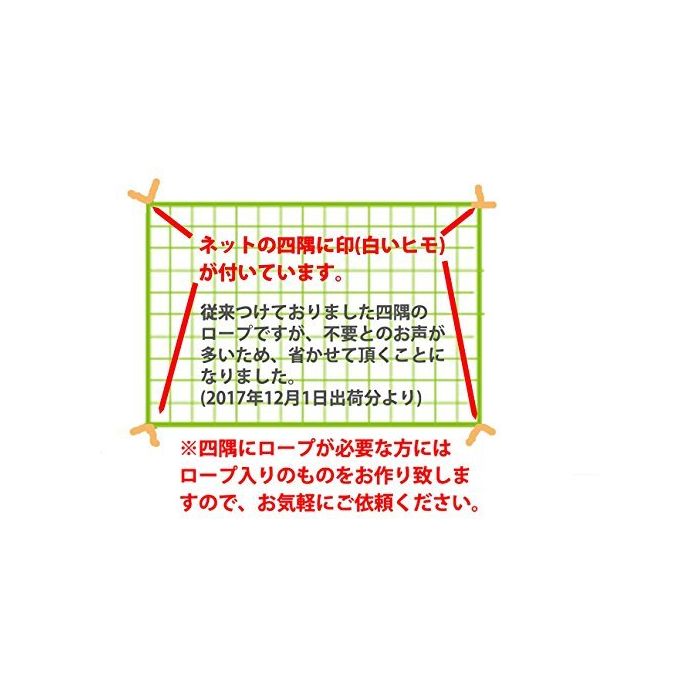 자사 가공 넷입니다.넷의 주위에는,폴리에틸렌의 로프(6밀리)가 꿰매 붙여 있습니다.5밀리 로프로도 변경 가능합니다.