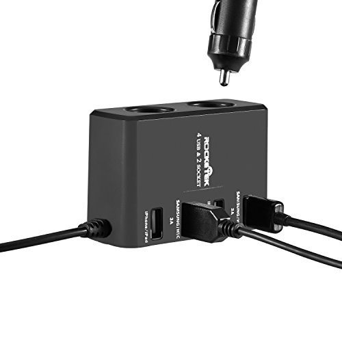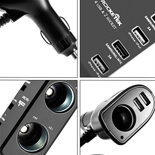 - Title : Rocketek® 9.1A/45.5W USB Car Charger with 6 USB and 3 sockets car splitter adapter for front seats and back seats use (35"Cable Length). Front usb car charger have 2 USB high output and 1 car cigarette lighter socket. Another 4 high output USB port + 2 car splitter sockets for back seats use. Support iPhone 6 5s 5c 5; iPad Air mini; Galaxy S5 S4; Note 3 2; the new HTC One (M8); Nexus, MTD, MP3 and other USB port electronic devices